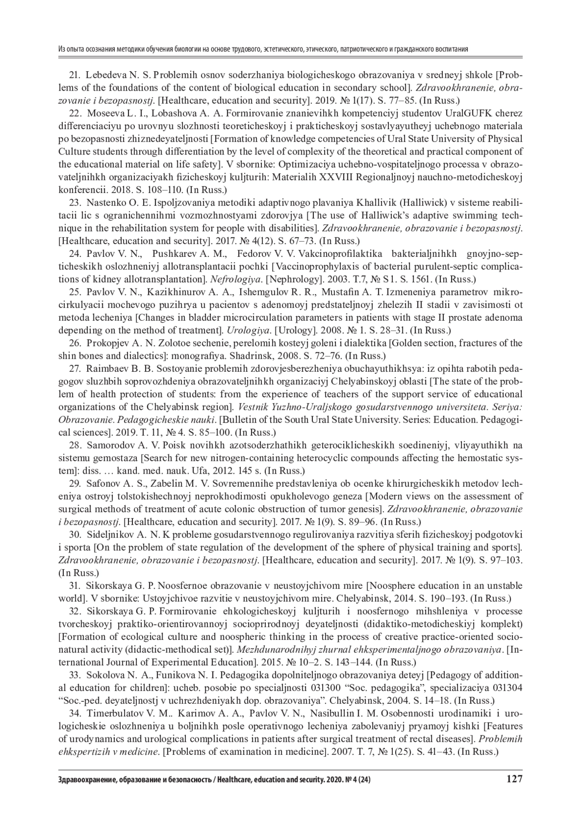 27. Раимбаев, Б. Б. Состояние проблемы здоровьесбережения обучающихся: из опыта работы педагогов службы сопровождения образовательных организаций Челябинской области / Б. Б. Раимбаев // Вестник Южно-Уральского государственного университета. Серия: Образование. Педагогические науки. - 2019. - Т. 11, № 4. - С. 85-100. EDN: AIBRIQ