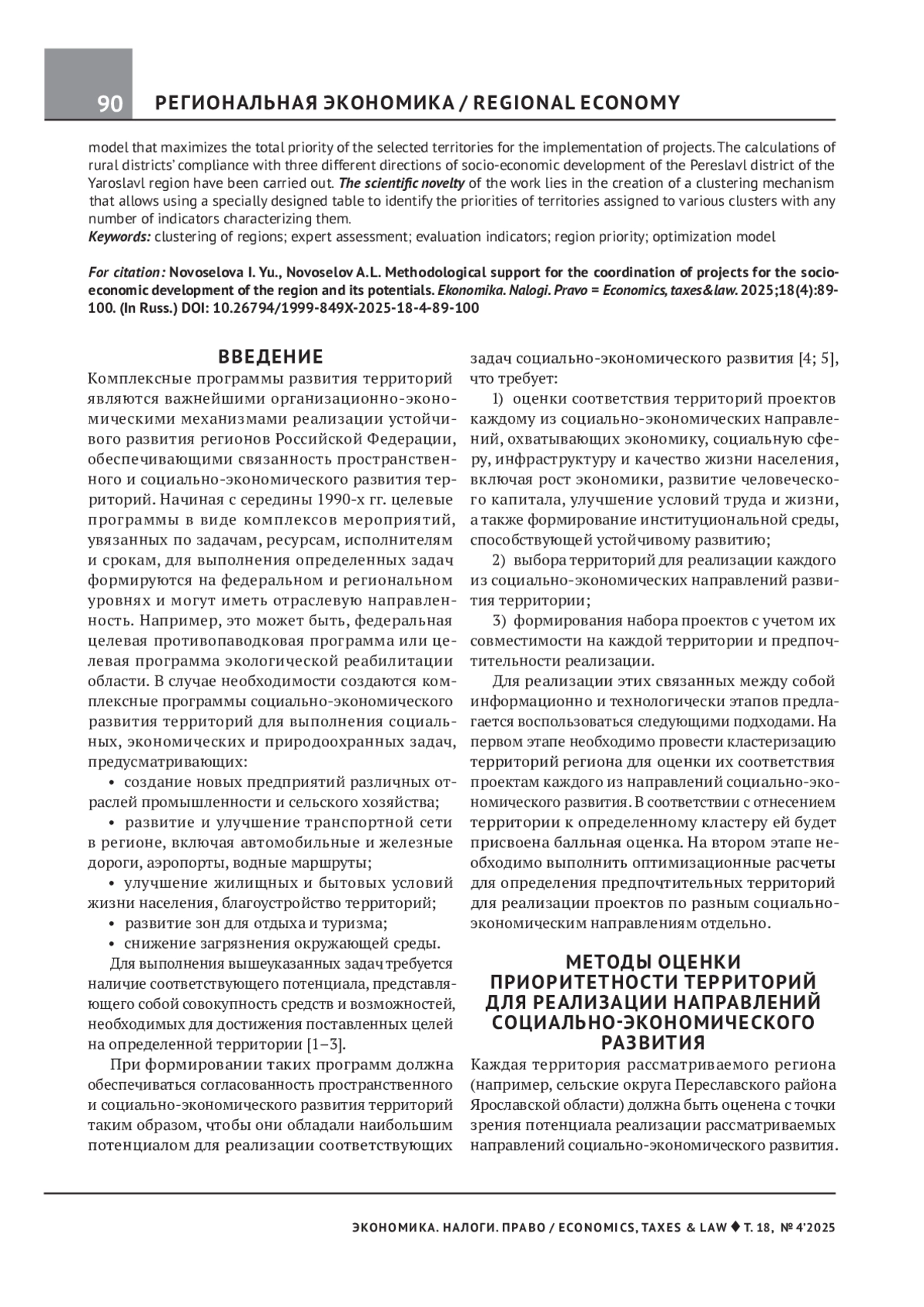Предмет исследования — проекты социально-экономического развития на территории региона, обеспечивающие наиболее полный учет социальных, географических, ландшафтных, транспортных и других преимуществ рассматриваемых территорий. Цель — разработка механизма согласования проектов социально-экономического развития региона с учетом потенциалов его территорий, позволяющего сокращать затраты на реализацию проектов, сберегать историко-архитектурные и природные объекты для будущих поколений. Получены следующие результаты: создан экспертно-расчетный механизм, включающий систему показателей, характеризующих потенциальные возможности территории для реализации проектов по разным направлениям социально-экономического развития; осуществлена группировка множества объектов на подмножества для балльной оценки соответствия территории региона требованиям новых проектов; сформирована оптимизационная модель, максимизирующая суммарный приоритет выбираемых территорий для реализации проектов. Проведены также расчеты соответствия сельских округов трем различным направлениям социально-экономического развития Переславского района Ярославской области. Научная новизна работы заключается в создании механизма кластеризации, позволяющего с помощью специально разработанной таблицы выявлять приоритеты территорий, отнесенных к различным кластерам при любом числе характеризующих их показателей
