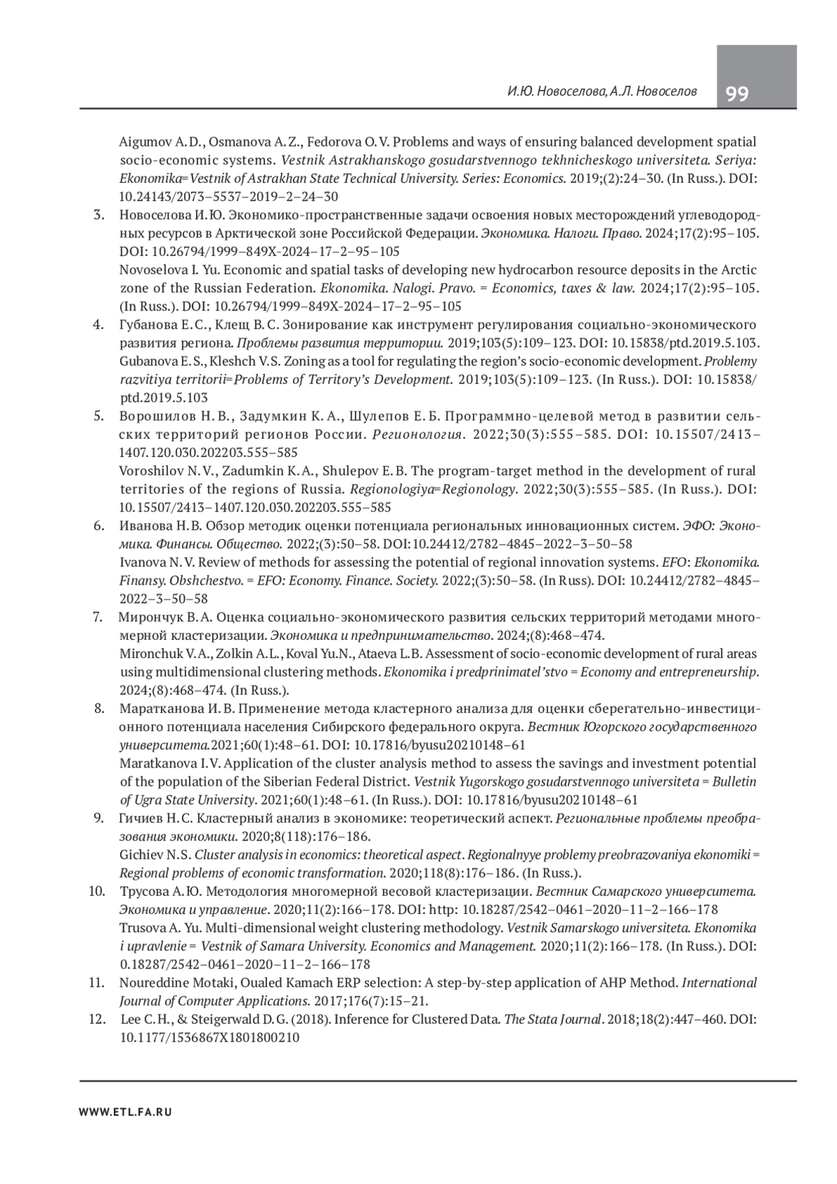 7. Мирончук В.А. Оценка социально-экономического развития сельских территорий методами многомерной кластеризации. Экономика и предпринимательство. 2024;(8):468-474. EDN: BFUIJV