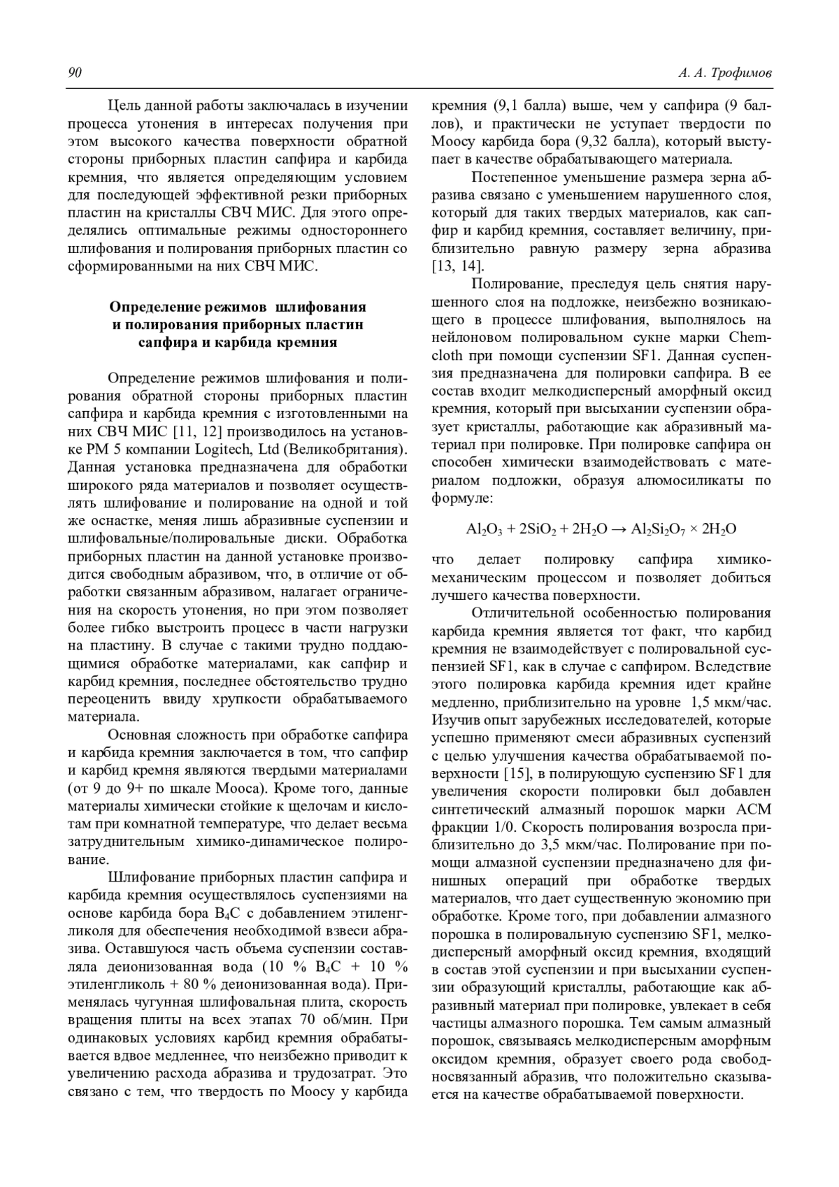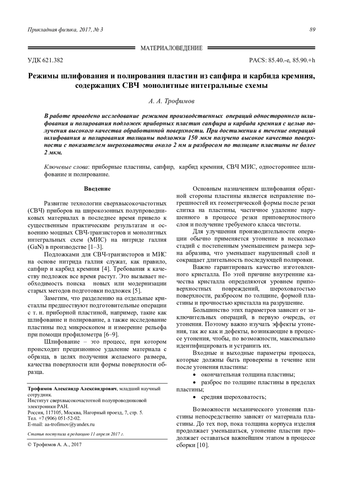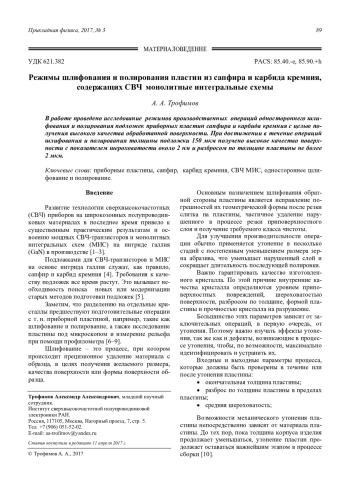 Трофимов А. А. Режимы шлифования и полирования пластин из сапфира и карбида кремния, содержащих СВЧ монолитные интегральные схемы 89