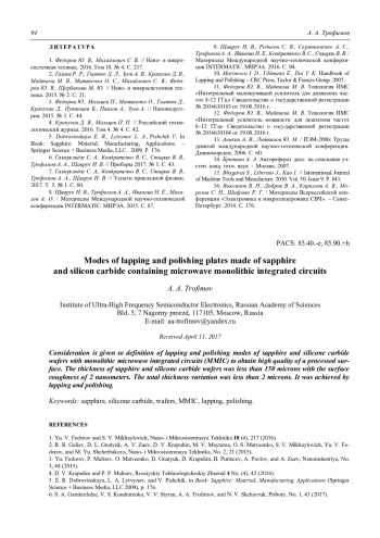 A. A. Trofimov Modes of lapping and polishing plates made of sapphire and silicon carbide containing microwave monolithic integrated сircuits 89
