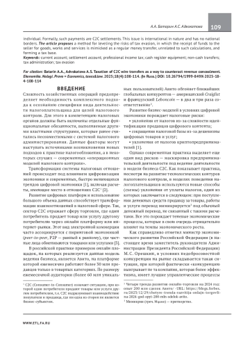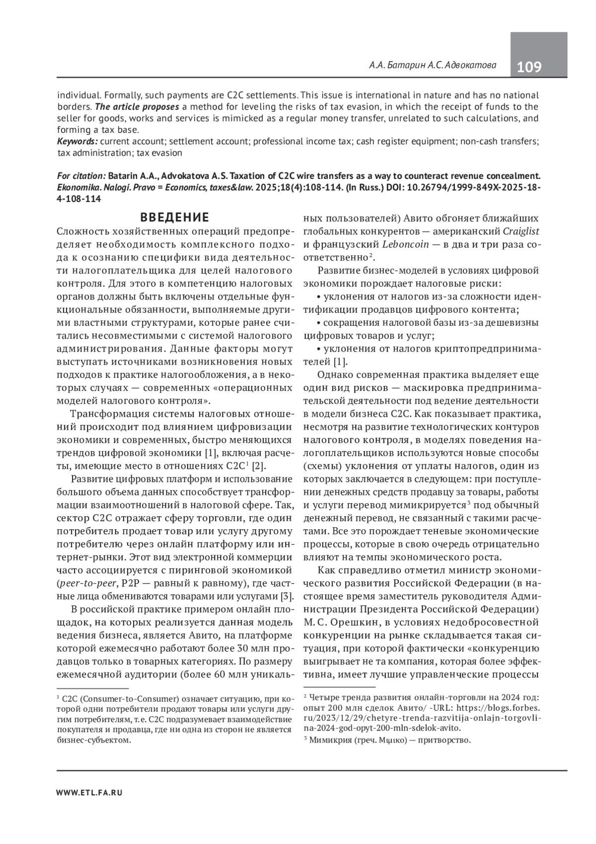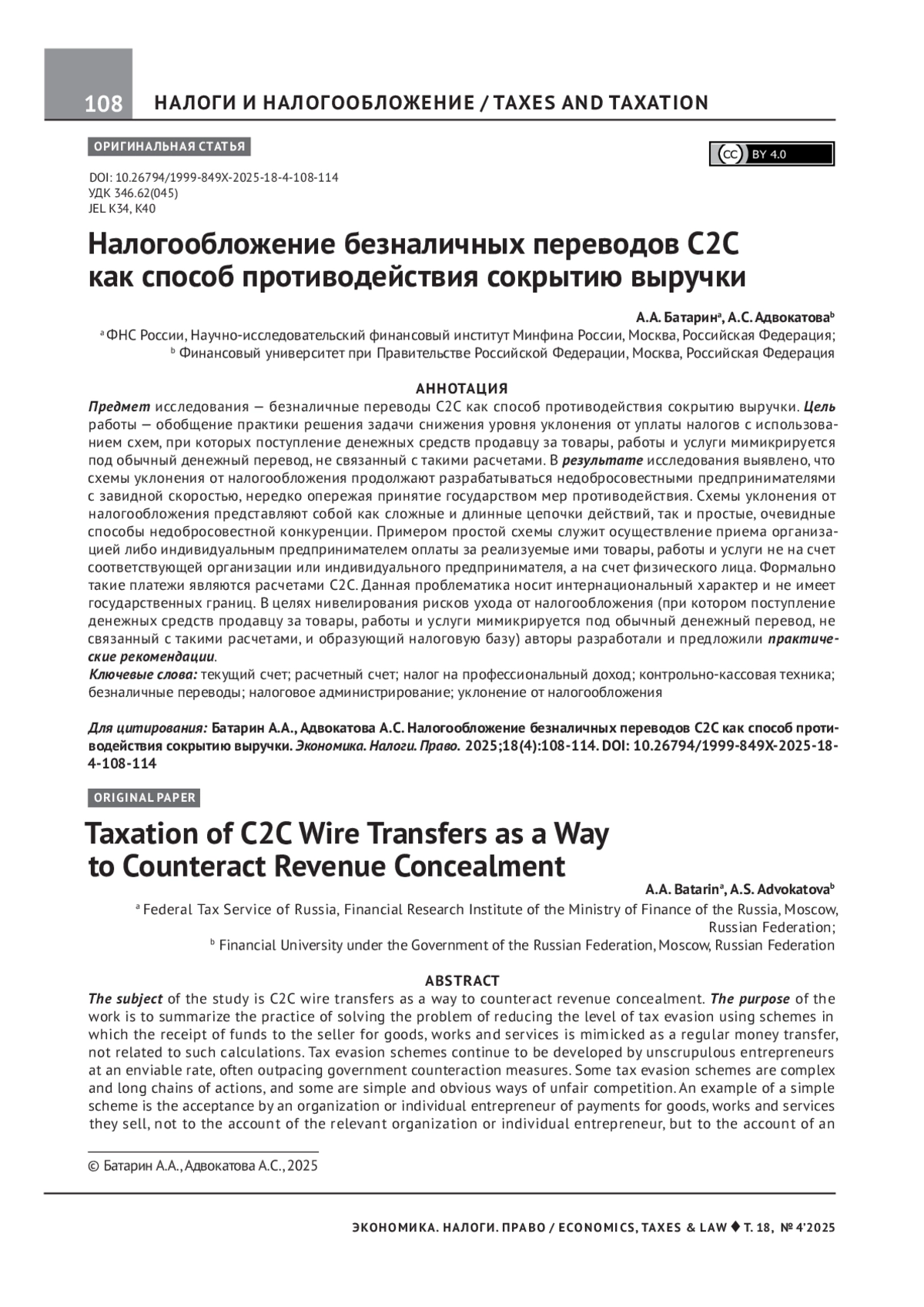 Предмет исследования — безналичные переводы С2С как способ противодействия сокрытию выручки. Цель работы — обобщение практики решения задачи снижения уровня уклонения от уплаты налогов с использованием схем, при которых поступление денежных средств продавцу за товары, работы и услуги мимикрируется под обычный денежный перевод, не связанный с такими расчетами. В результате исследования выявлено, что схемы уклонения от налогообложения продолжают разрабатываться недобросовестными предпринимателями с завидной скоростью, нередко опережая принятие государством мер противодействия. Схемы уклонения от налогообложения представляют собой как сложные и длинные цепочки действий, так и простые, очевидные способы недобросовестной конкуренции. Примером простой схемы служит осуществление приема организацией либо индивидуальным предпринимателем оплаты за реализуемые ими товары, работы и услуги не на счет соответствующей организации или индивидуального предпринимателя, а на счет физического лица. Формально такие платежи являются расчетами С2С. Данная проблематика носит интернациональный характер и не имеет государственных границ. В целях нивелирования рисков ухода от налогообложения (при котором поступление денежных средств продавцу за товары, работы и услуги мимикрируется под обычный денежный перевод, не связанный с такими расчетами, и образующий налоговую базу) авторы разработали и предложили практические рекомендации