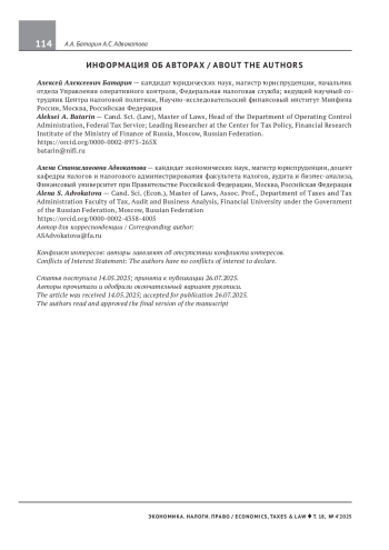 8. АдвокатоваА.С. Налоговый контроль в условиях модификации отношений налоговых органов и налогоплательщиков. Монография. М.: Русайнс; 2020. 190 с. EDN: QDQTVR