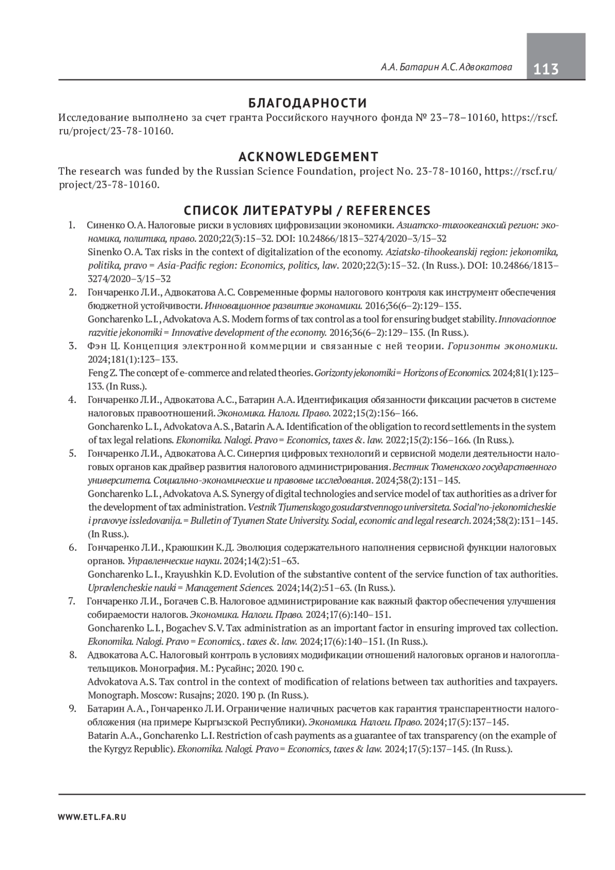 9. Батарин А.А., Гончаренко Л.И. Ограничение наличных расчетов как гарантия транспарентности налогообложения (на примере Кыргызской Республики). Экономика. Налоги. Право. 2024;17(5):137-145. EDN: RLVONS