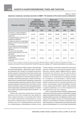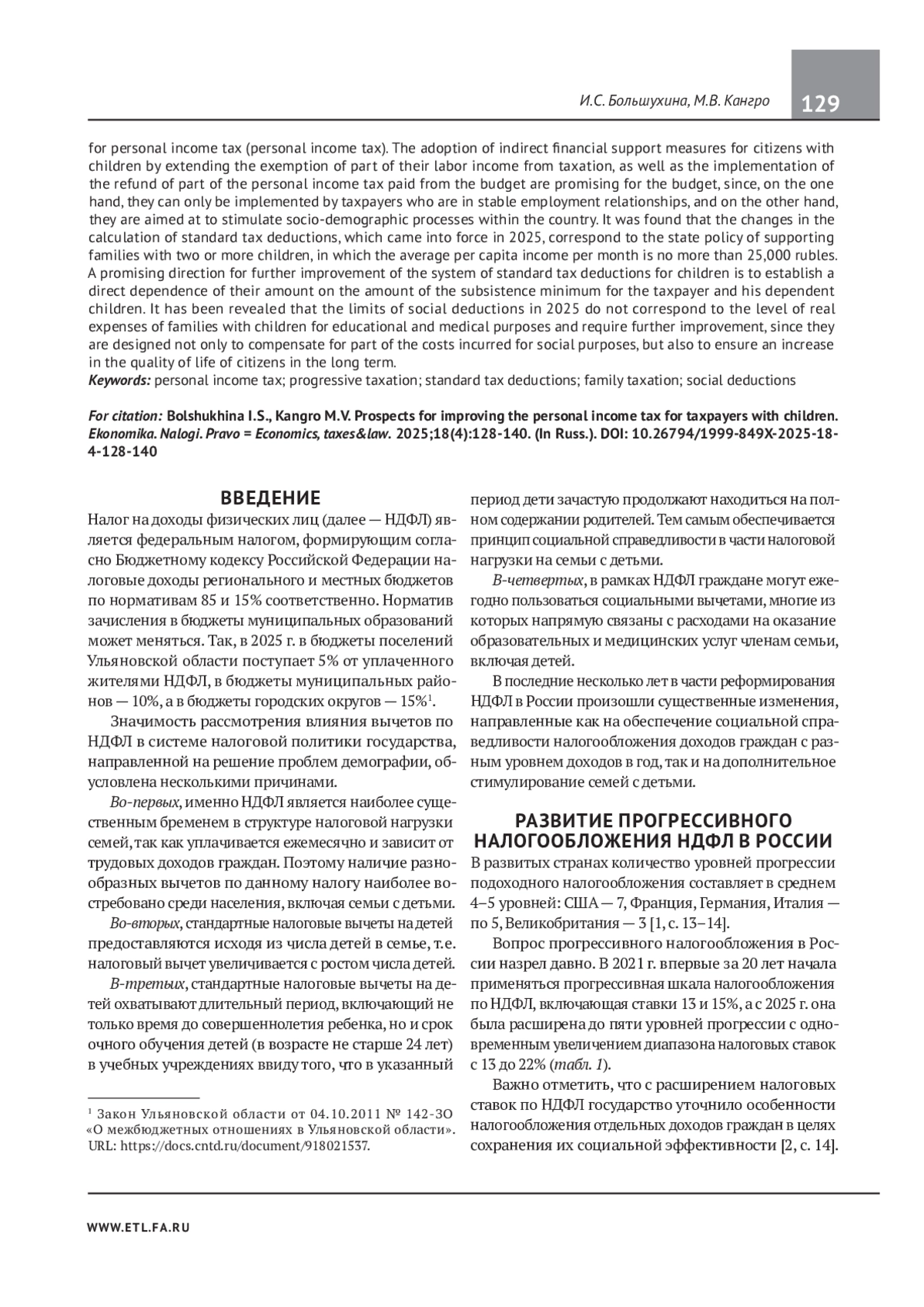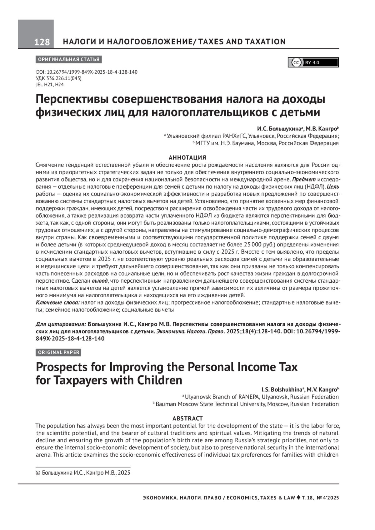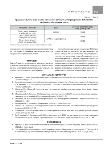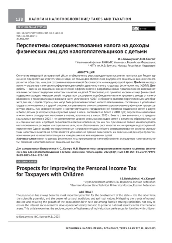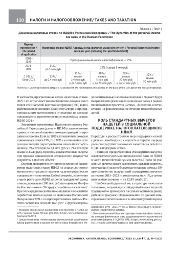 Смягчение тенденций естественной убыли и обеспечение роста рождаемости населения являются для России од - ними из приоритетных стратегических задач не только для обеспечения внутреннего социально-экономического развития общества, но и для сохранения национальной безопасности на международной арене. Предмет исследования — отдельные налоговые преференции для семей с детьми по налогу на доходы физических лиц (НДФЛ). Цель работы — оценка их социально-экономической эффективности и разработка новых предложений по совершенствованию системы стандартных налоговых вычетов на детей. Установлено, что принятие косвенных мер финансовой поддержки граждан, имеющих детей, посредством расширения освобождения части их трудового дохода от налогообложения, а также реализация возврата части уплаченного НДФЛ из бюджета являются перспективными для бюджета, так как, с одной стороны, они могут быть реализованы только налогоплательщиками, состоящими в устойчивых трудовых отношениях, а с другой стороны, направлены на стимулирование социально-демографических процессов внутри страны. Как своевременными и соответствующими государственной политике поддержки семей с двумя и более детьми (в которых среднедушевой доход в месяц составляет не более 25 000 руб.) определены изменения в исчислении стандартных налоговых вычетов, вступившие в силу с 2025 г. Вместе с тем выявлено, что пределы социальных вычетов в 2025 г. не соответствуют уровню реальных расходов семей с детьми на образовательные и медицинские цели и требуют дальнейшего совершенствования, так как они призваны не только компенсировать часть понесенных расходов на социальные цели, но и обеспечивать рост качества жизни граждан в долгосрочной перспективе. Сделан вывод, что перспективным направлением дальнейшего совершенствования системы стандартных налоговых вычетов на детей является установление прямой зависимости их величины от размера прожиточного минимума на налогоплательщика и находящихся на его иждивении детей