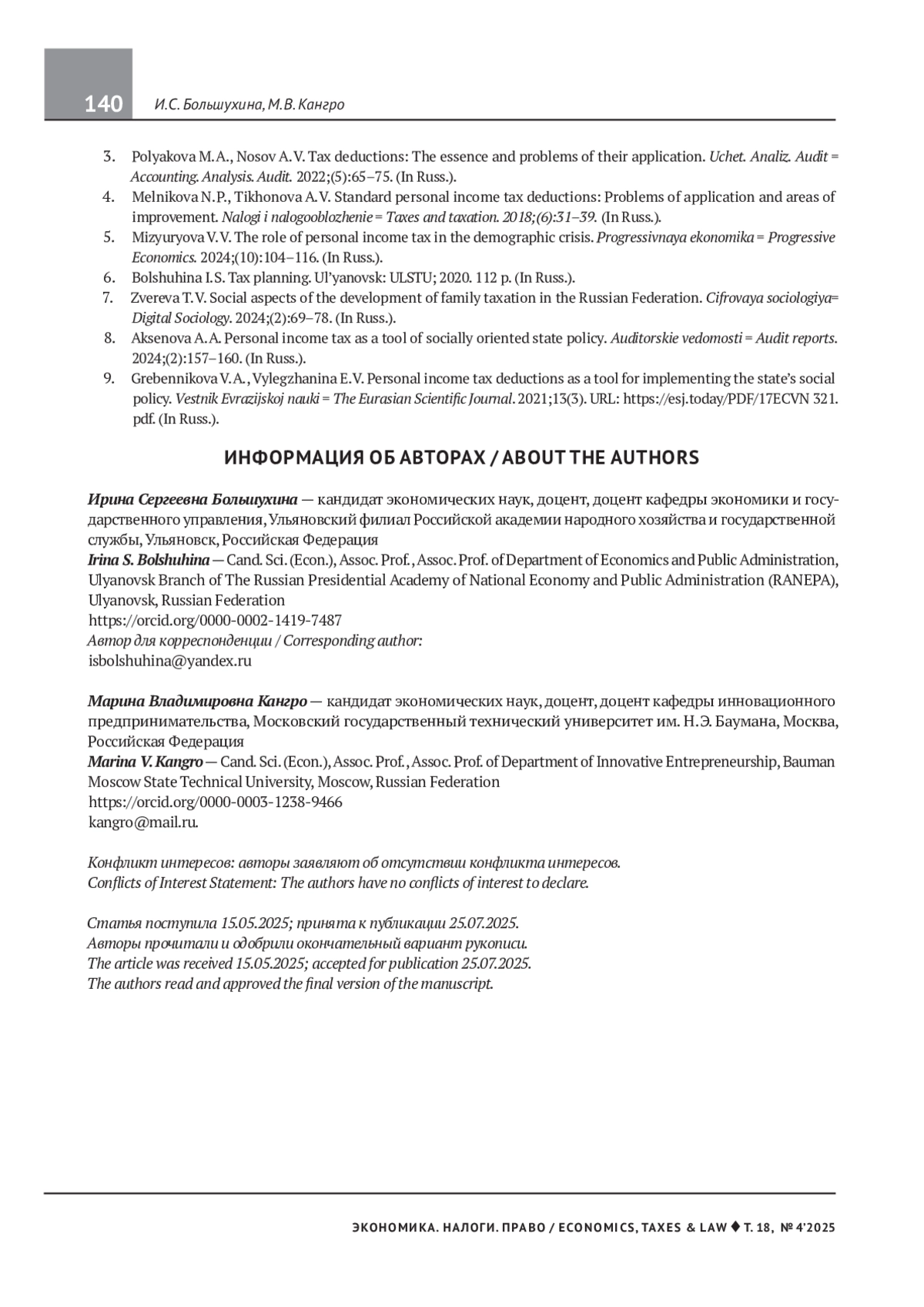 9. Гребенникова В.А., Вылегжанина Е.В. Налоговые вычеты по НДФЛ как инструмент реализации социальной политики государства. Вестник Евразийской науки. 2021;13(3). URL: https://esj.today/PDF/17ECVN 321.pdf. EDN: TXXXTC