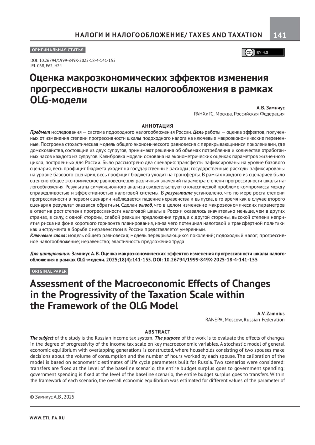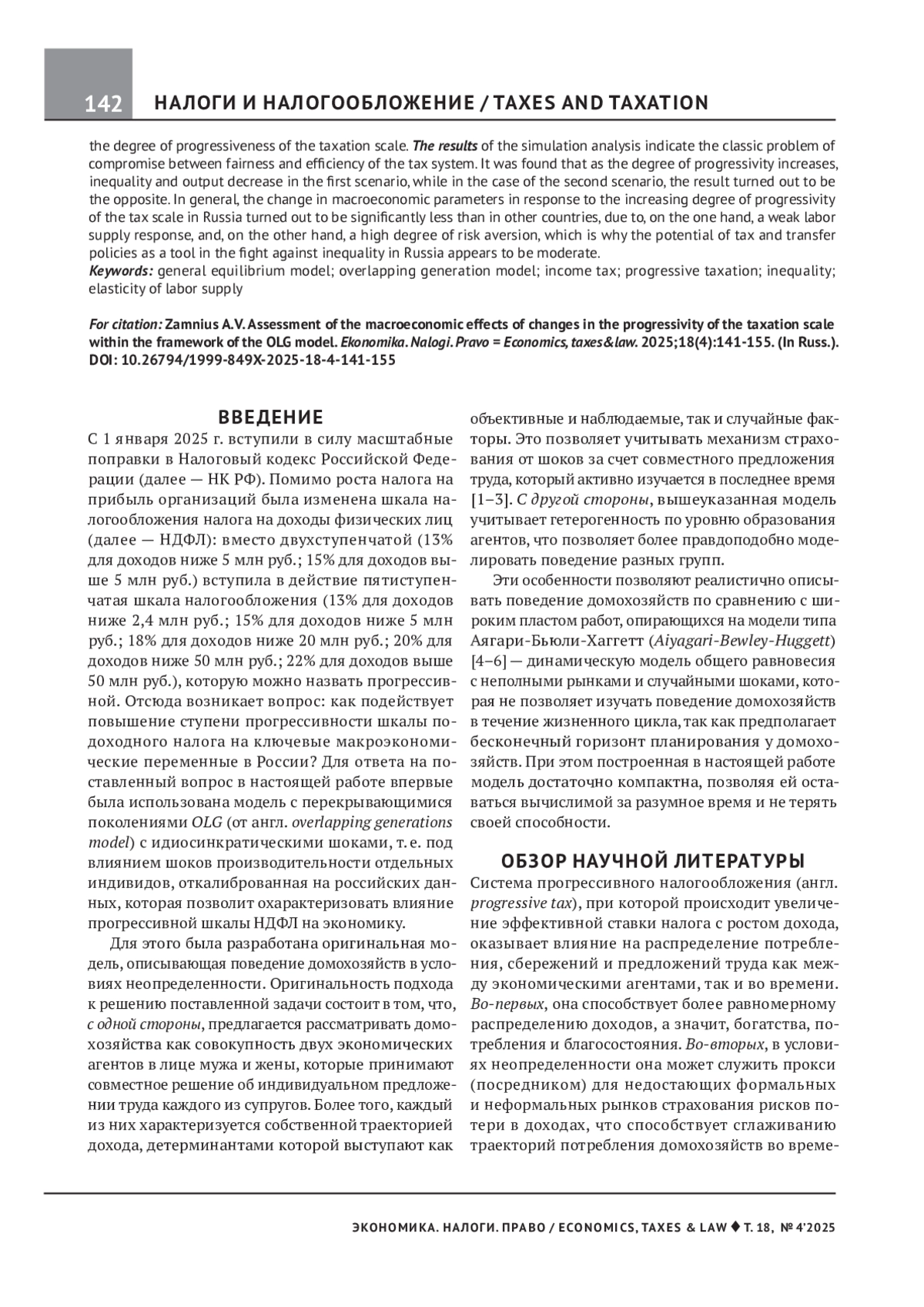 С 1 января 2025 г. вступили в силу масштабные поправки в Налоговый кодекс Российской Феде - рации (далее — НК РФ). Помимо роста налога на прибыль организаций была изменена шкала налогообложения налога на доходы физических лиц (далее — НДФЛ): вместо двухступенчатой (13% для доходов ниже 5 млн руб.; 15% для доходов выше 5 млн руб.) вступила в действие пятиступенчатая шкала налогообложения (13% для доходов ниже 2,4 млн руб.; 15% для доходов ниже 5 млн руб.; 18% для доходов ниже 20 млн руб.; 20% для доходов ниже 50 млн руб.; 22% для доходов выше 50 млн руб.), которую можно назвать прогрессивной. Отсюда возникает вопрос: как подействует повышение ступени прогрессивности шкалы подоходного налога на ключевые макроэкономические переменные в России? Для ответа на поставленный вопрос в настоящей работе впервые была использована модель с перекрывающимися поколениями OLG (от англ. overlapping generations model) с идиосинкратическими шоками, т. е. под влиянием шоков производительности отдельных индивидов, откалиброванная на российских данных, которая позволит охарактеризовать влияние прогрессивной шкалы НДФЛ на экономику.