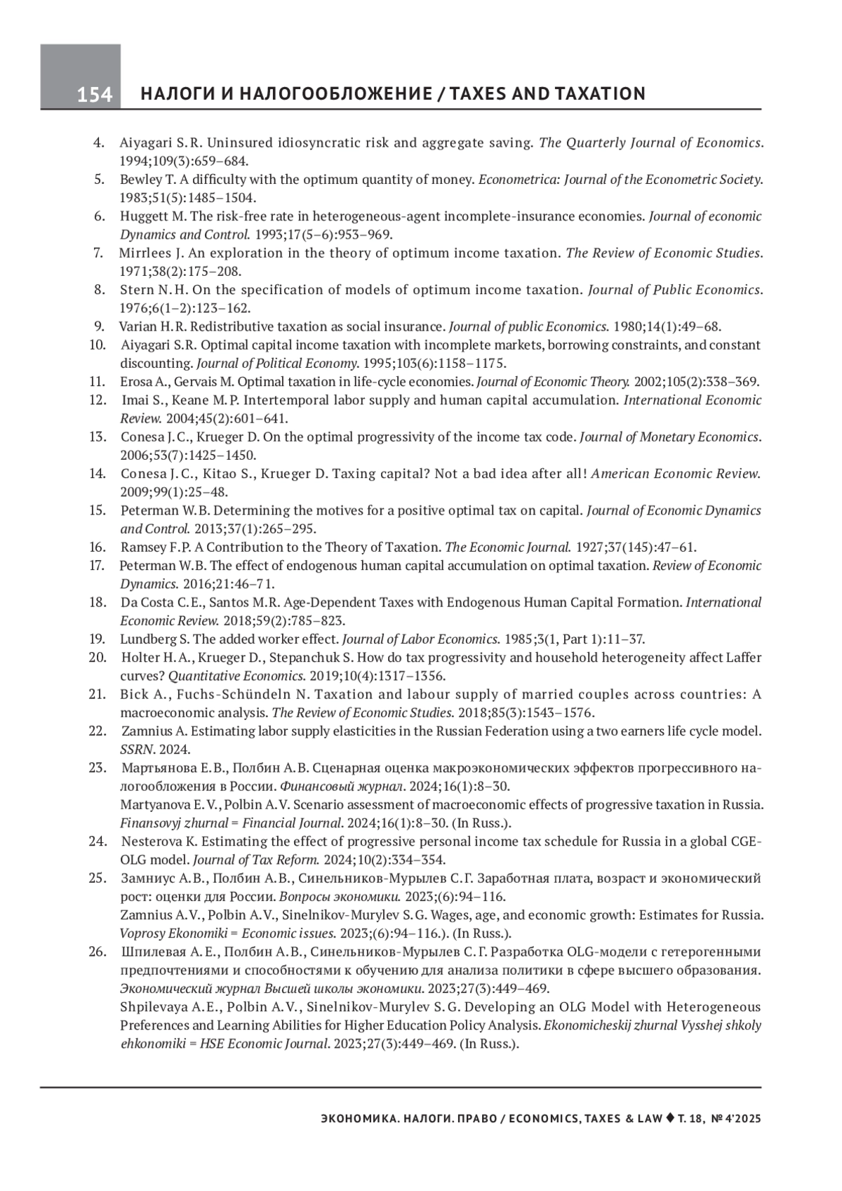 11. Erosa A., Gervais M. Optimal taxation in life-cycle economies. Journal of Economic Theory. 2002;105(2):338-369. EDN: BCSMVF
