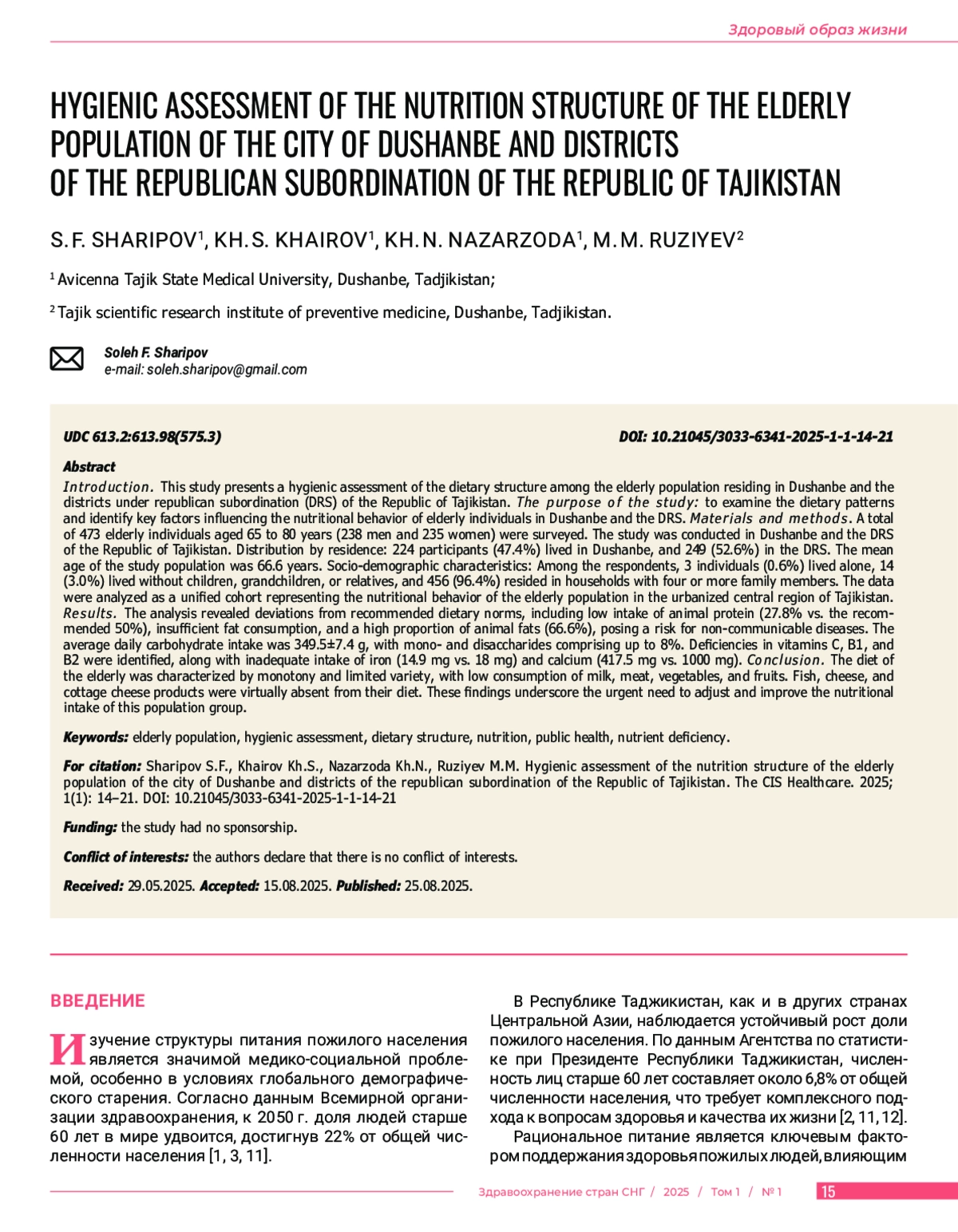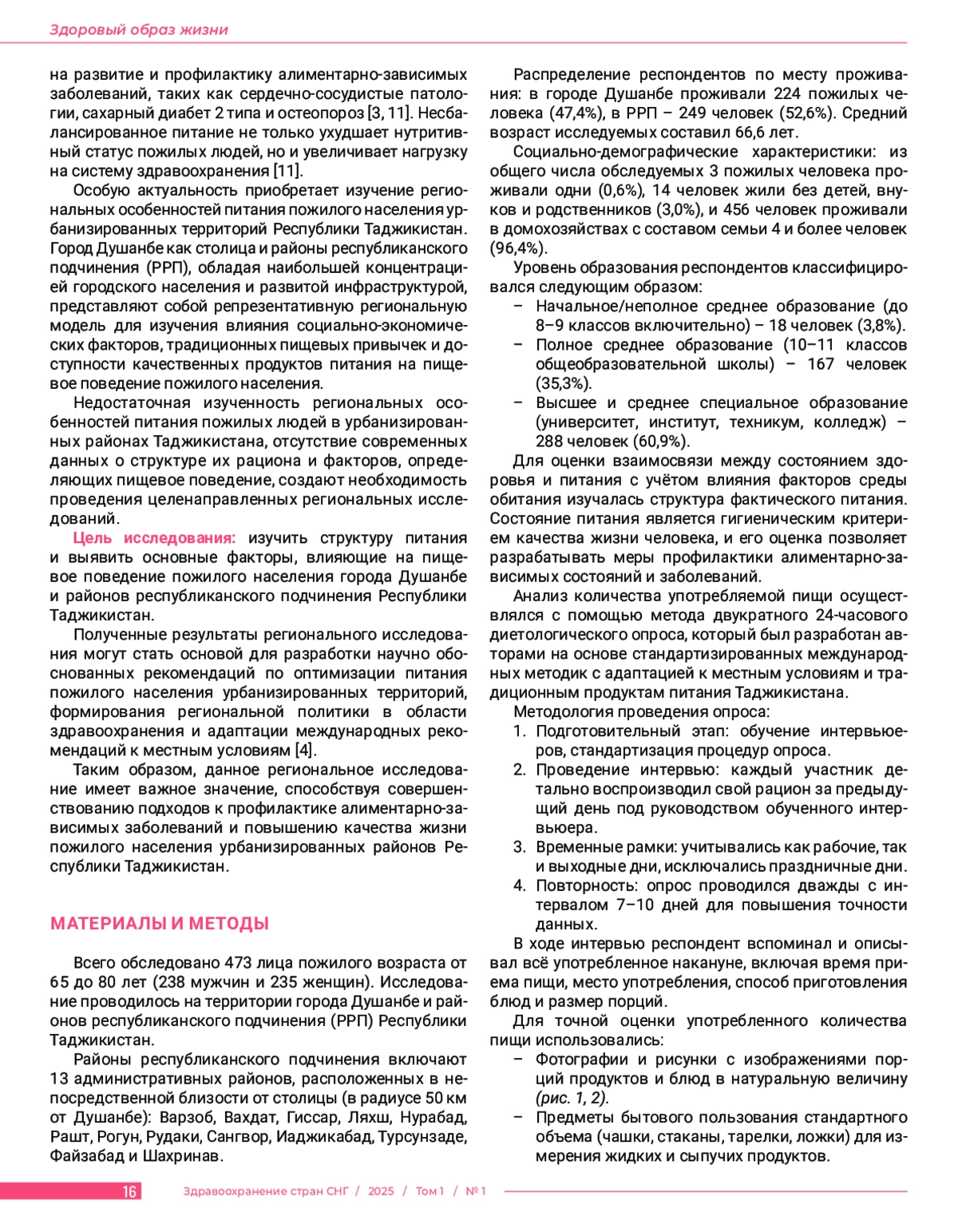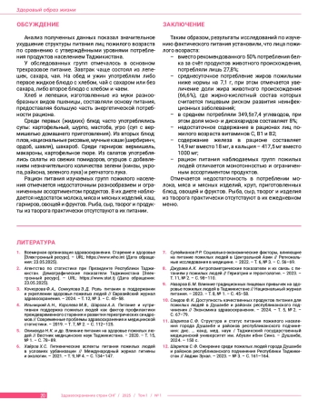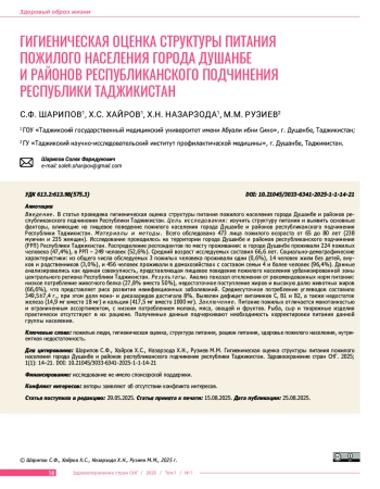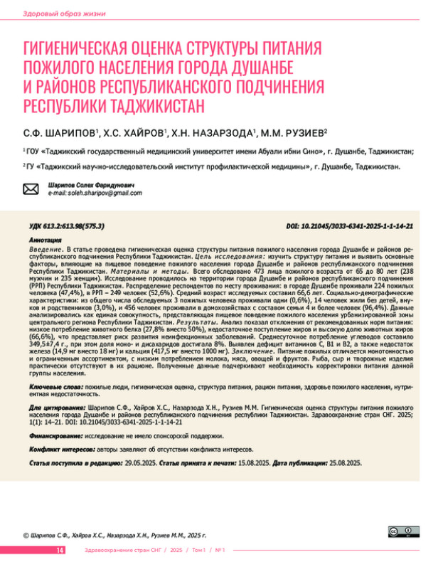 В в е д е н и е. В статье проведена гигиеническая оценка структуры питания пожилого населения города Душанбе и районов республиканского подчинения Республики Таджикистан. Ц е л ь и с с л е д о в а н и я: изучить структуру питания и выявить основные факторы, влияющие на пищевое поведение пожилого населения города Душанбе и районов республиканского подчинения Республики Таджикистан. М а т е р и а л ы и м е т о д ы. Всего обследовано 473 лица пожилого возраста от 65 до 80 лет (238 мужчин и 235 женщин). Исследование проводилось на территории города Душанбе и районов республиканского подчинения (РРП) Республики Таджикистан. Распределение респондентов по месту проживания: в городе Душанбе проживали 224 пожилых человека (47,4%), в РРП – 249 человек (52,6%). Средний возраст исследуемых составил 66,6 лет. Социально-демографические характеристики: из общего числа обследуемых 3 пожилых человека проживали одни (0,6%), 14 человек жили без детей, внуков и родственников (3,0%), и 456 человек проживали в домохозяйствах с составом семьи 4 и более человек (96,4%). Данные анализировались как единая совокупность, представляющая пищевое поведение пожилого населения урбанизированной зоны центрального региона Республики Таджикистан. Р е з у л ь т а т ы. Анализ показал отклонения от рекомендованных норм питания: низкое потребление животного белка (27,8% вместо 50%), недостаточное поступление жиров и высокую долю животных жиров (66,6%), что представляет риск развития неинфекционных заболеваний. Среднесуточное потребление углеводов составило 349,5±7,4 г., при этом доля моно- и дисахаридов достигала 8%. Выявлен дефицит витаминов С, В1 и В2, а также недостаток железа (14,9 мг вместо 18 мг) и кальция (417,5 мг вместо 1000 мг). З а к л ю ч е н и е. Питание пожилых отличается монотонностью и ограниченным ассортиментом, с низким потреблением молока, мяса, овощей и фруктов. Рыба, сыр и творожные изделия практически отсутствуют в их рационе. Полученные данные подчеркивают необходимость корректировки питания данной группы населения.
