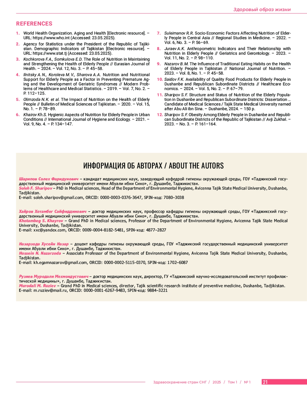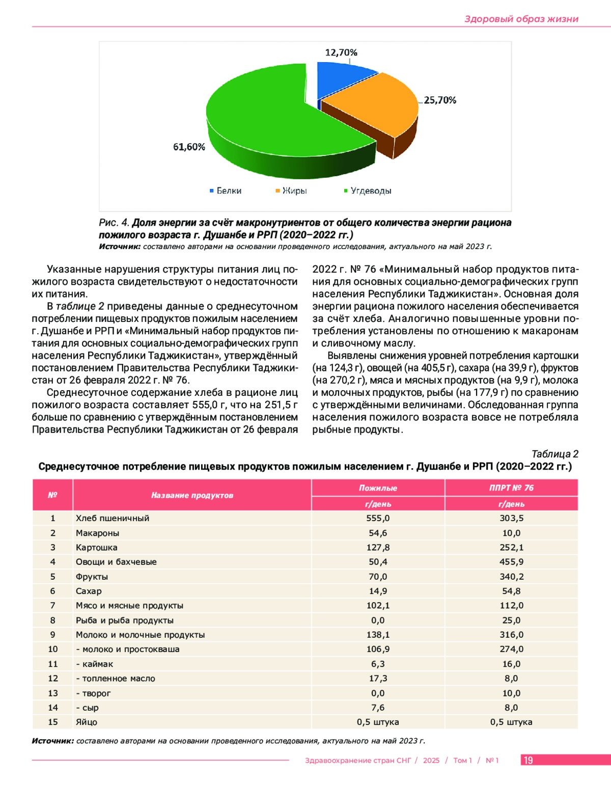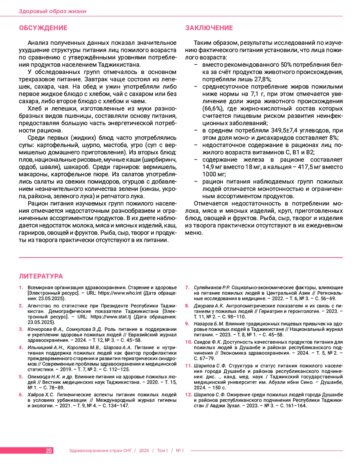 В в е д е н и е. В статье проведена гигиеническая оценка структуры питания пожилого населения города Душанбе и районов республиканского подчинения Республики Таджикистан. Ц е л ь и с с л е д о в а н и я: изучить структуру питания и выявить основные факторы, влияющие на пищевое поведение пожилого населения города Душанбе и районов республиканского подчинения Республики Таджикистан. М а т е р и а л ы и м е т о д ы. Всего обследовано 473 лица пожилого возраста от 65 до 80 лет (238 мужчин и 235 женщин). Исследование проводилось на территории города Душанбе и районов республиканского подчинения (РРП) Республики Таджикистан. Распределение респондентов по месту проживания: в городе Душанбе проживали 224 пожилых человека (47,4%), в РРП – 249 человек (52,6%). Средний возраст исследуемых составил 66,6 лет. Социально-демографические характеристики: из общего числа обследуемых 3 пожилых человека проживали одни (0,6%), 14 человек жили без детей, внуков и родственников (3,0%), и 456 человек проживали в домохозяйствах с составом семьи 4 и более человек (96,4%). Данные анализировались как единая совокупность, представляющая пищевое поведение пожилого населения урбанизированной зоны центрального региона Республики Таджикистан. Р е з у л ь т а т ы. Анализ показал отклонения от рекомендованных норм питания: низкое потребление животного белка (27,8% вместо 50%), недостаточное поступление жиров и высокую долю животных жиров (66,6%), что представляет риск развития неинфекционных заболеваний. Среднесуточное потребление углеводов составило 349,5±7,4 г., при этом доля моно- и дисахаридов достигала 8%. Выявлен дефицит витаминов С, В1 и В2, а также недостаток железа (14,9 мг вместо 18 мг) и кальция (417,5 мг вместо 1000 мг). З а к л ю ч е н и е. Питание пожилых отличается монотонностью и ограниченным ассортиментом, с низким потреблением молока, мяса, овощей и фруктов. Рыба, сыр и творожные изделия практически отсутствуют в их рационе. Полученные данные подчеркивают необходимость корректировки питания данной группы населения.