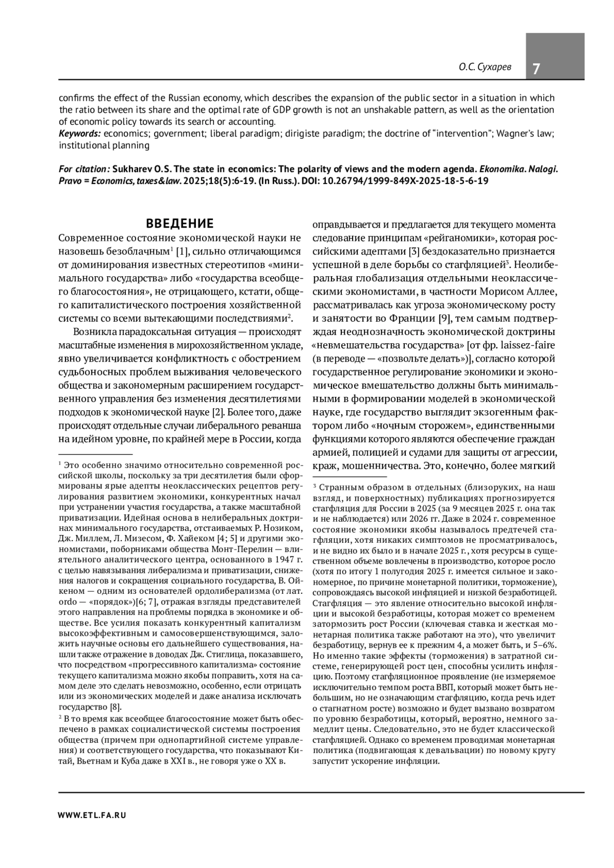 Предмет исследования — роль государства в экономической науке в полярной системе координат «неолиберализм — дирижизм» с выделением его системообразующей сущности в современную эпоху. Цель работы — доказательство неадекватности нарочитого идеологически детерминированного подхода к оценке государства в экономической науке с точек зрения минимизации его значения и доктрины «вмешательства — невмешательства», которые порождают оторванные от жизни интеллектуальные конструкции в экономической науке, экономические модели и аналитические рекомендации. Методологию настоящего исследования составляют теории государства в экономической науке, «системная экономика» и концепция, базирующаяся на отношении к государству как системообразующей основе современного развития. Основной результат исследования состоит в установлении того, что современная повестка дня в экономической науке требует системного рассмотрения процесса развития государства с отказом от применения неадекватных терминов и строящихся на них моделей, когда оно вмешивается или не вмешивается в рыночные отношения. Тем самым обосновывается необходимость исключения противопоставления государства и рынка с целью преодоления самой важной методологической проблемы экономического знания и получения наиболее адекватных моделей развития и инструментов управления экономикой и обществом. Сделан вывод о том, что в отношении российской экономики частично подтверждается действие закона Вагнера, описывающего расширение государственного сектора в ситуации, при которой соотношение между его долей и оптимальным темпом роста ВВП не является незыблемой закономерностью, так же как ориентация экономической политики на его поиск или учет.