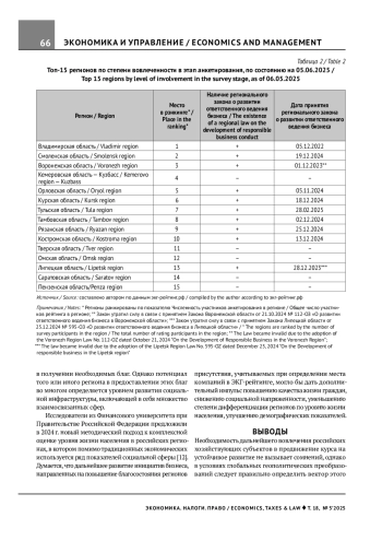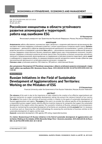 Актуальность работы обусловлена значимостью задач, связанных с созданием действенного организационно-финансового механизма поддержки устойчивого развития с учетом национальных интересов нашей страны. Предмет исследования — деятельность субъектов предпринимательской деятельности во взаимосвязи с целями устойчивого развития российских агломераций и регионов. Цель работы — рассмотрение национальных особенностей развития системы поддержки ответственного бизнеса, выявление эффективных мер стимулирования компаний, способст - вующих поддержке устойчивого развития регионов присутствия. Рассмотрены успешные инициативы российских компаний и предпринимателей, ориентированные на поддержание устойчивого развития территорий, сделан вывод о необходимости продолжения работы по совершенствованию единой методологии оценки вклада субъектов предпринимательской деятельности в устойчивое развитие регионов и государства