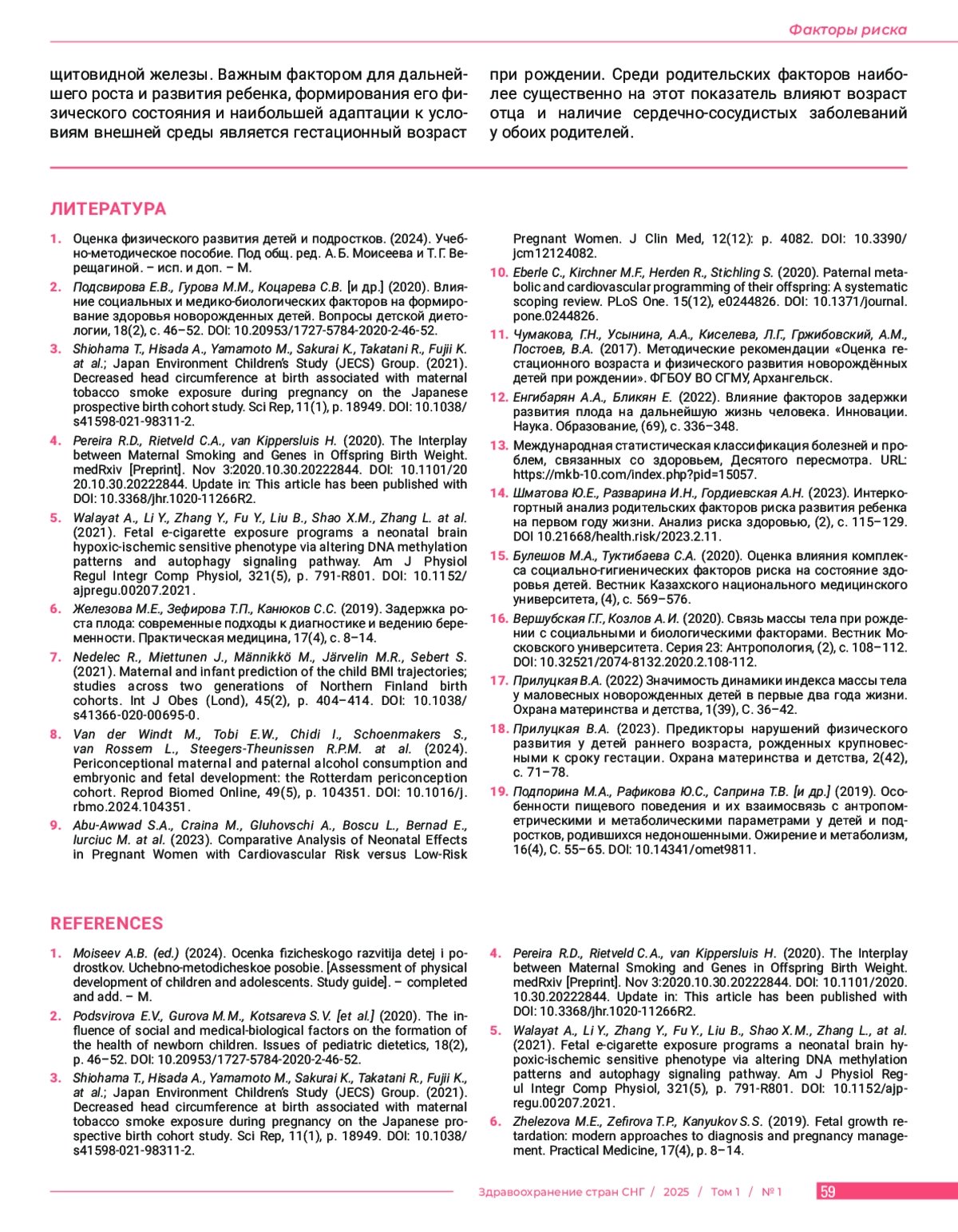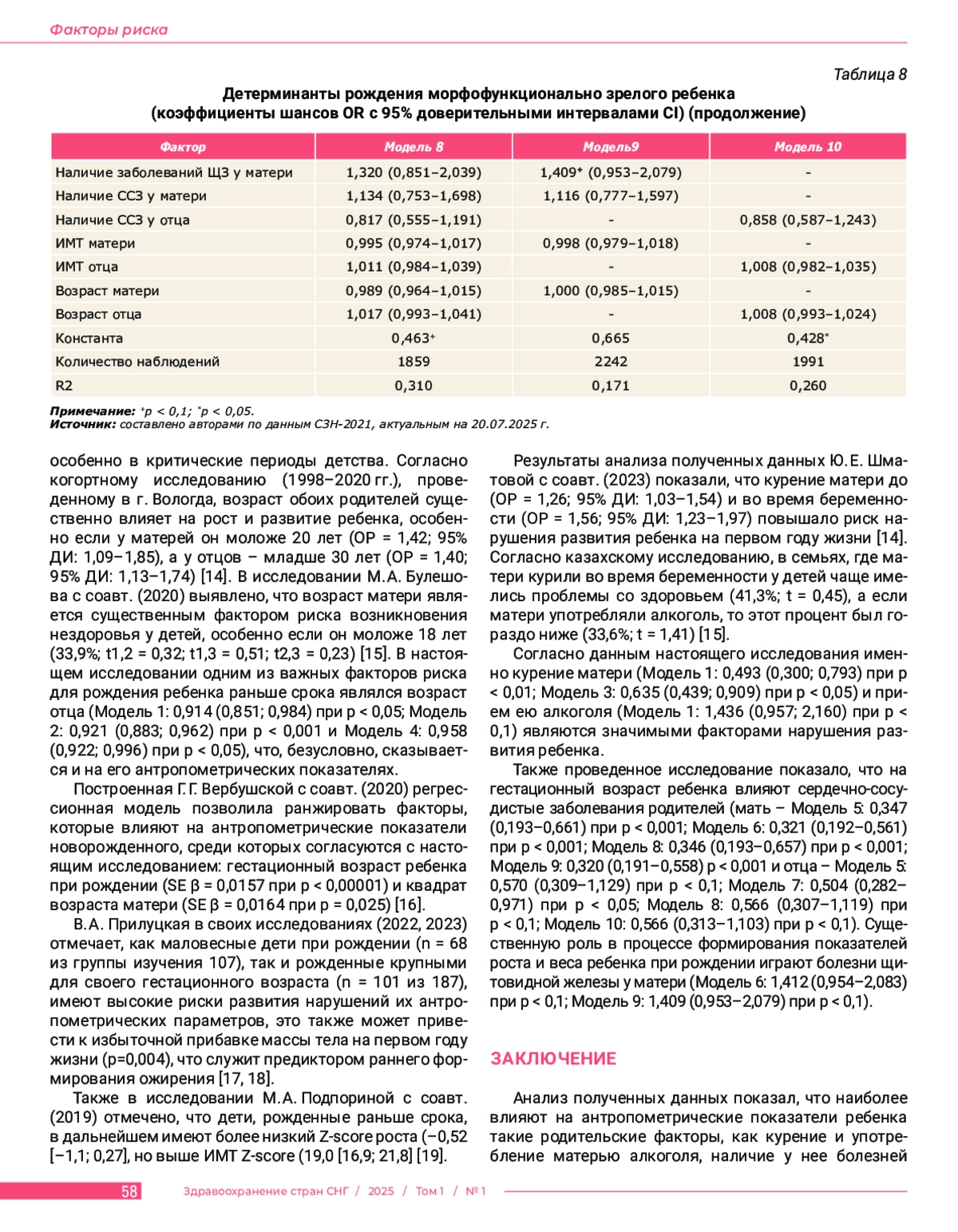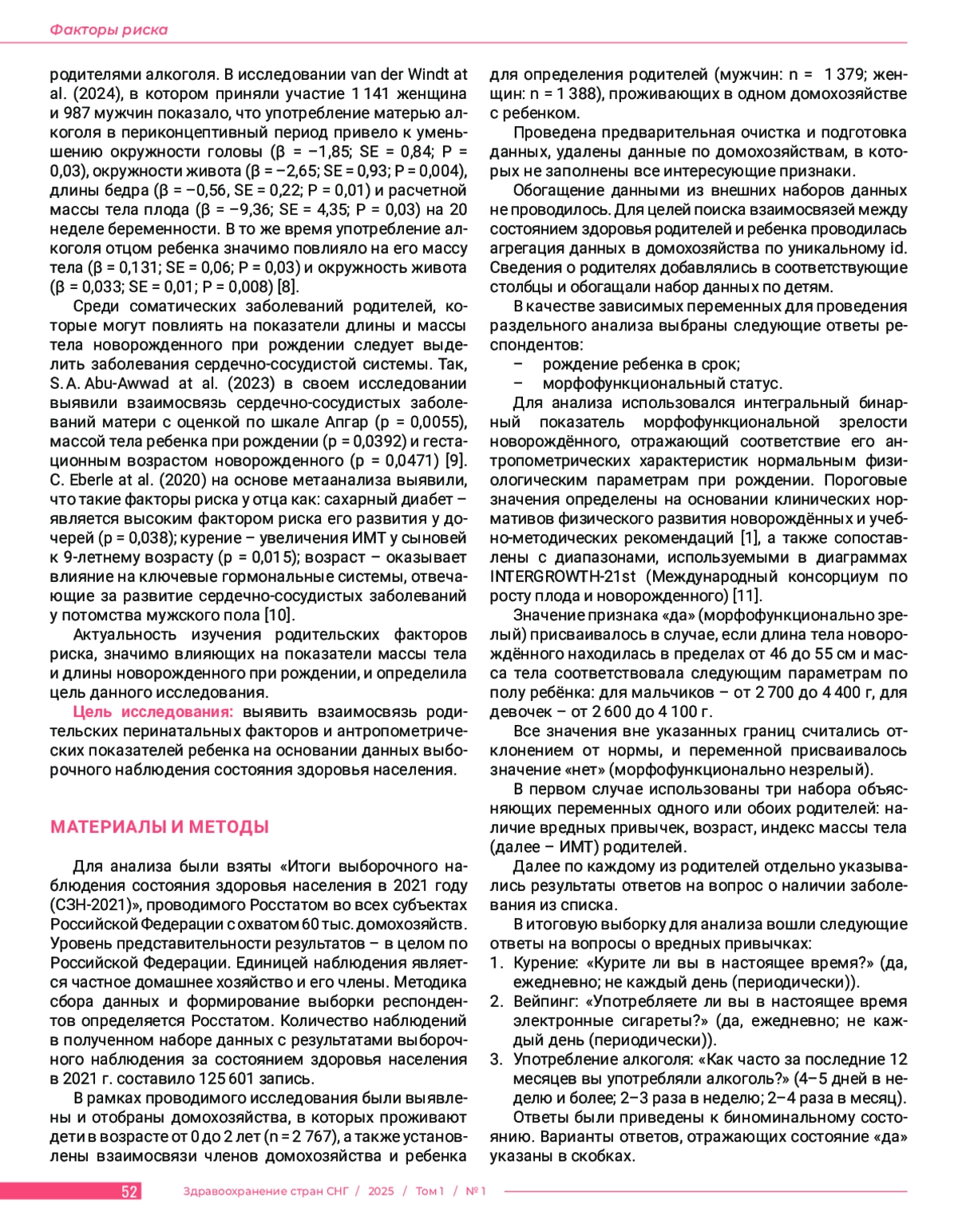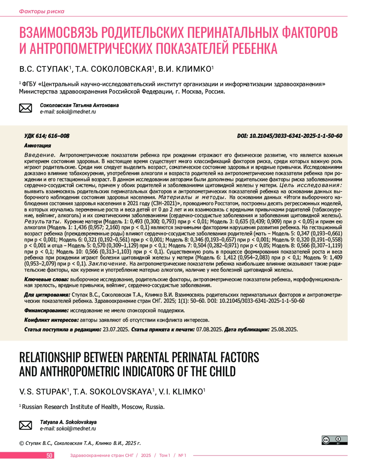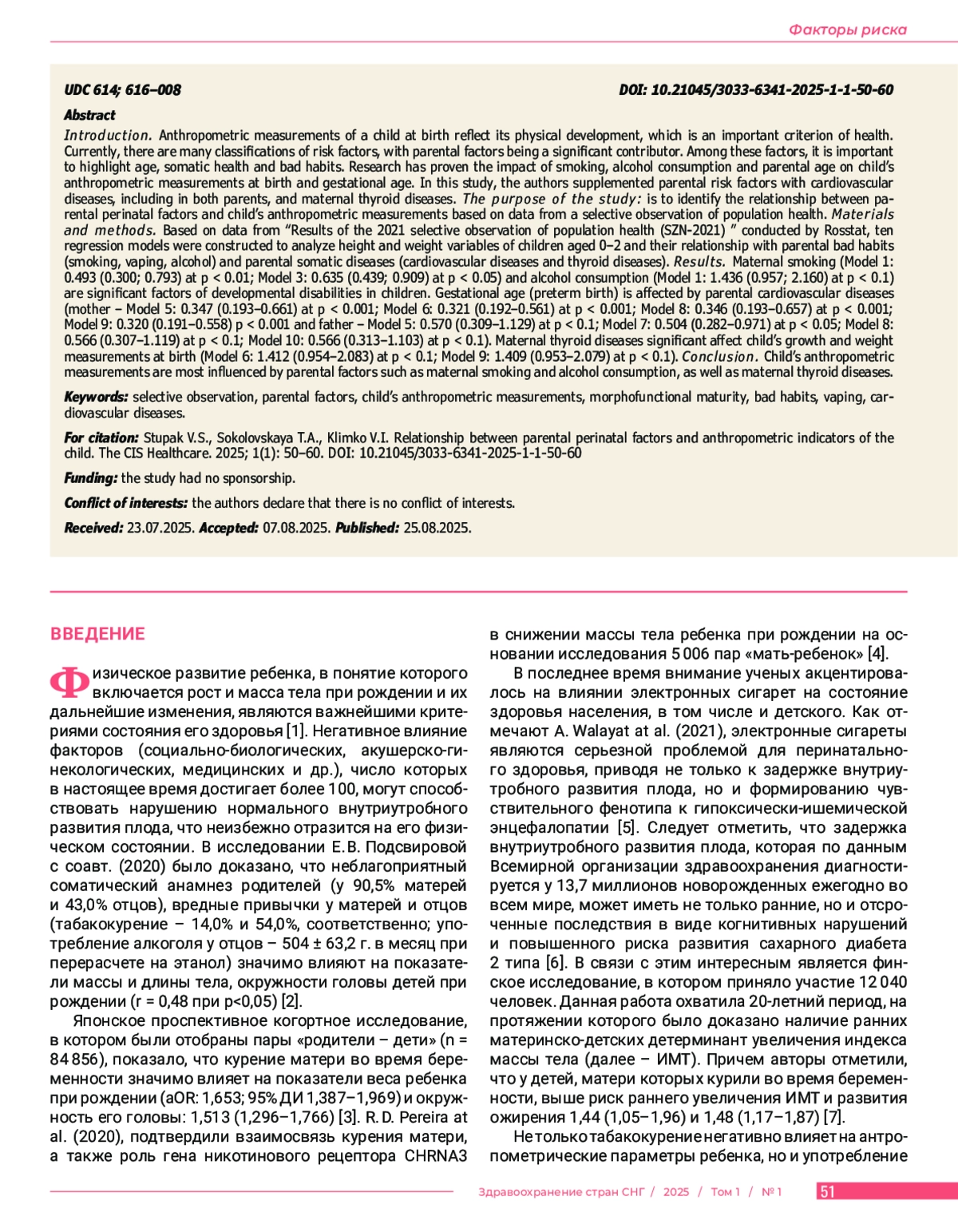 Введение. Антропометрические показатели ребенка при рождении отражают его физическое развитие, что является важным критерием состояния здоровья. В настоящее время существует много классификаций факторов риска, среди которых важную роль играют родительские. Среди них следует выделить возраст, соматическое состояние здоровья и вредные привычки. Исследованиями доказано влияние табакокурения, употребления алкоголя и возраста родителей на антропометрические показатели ребенка при рождении и его гестационный возраст. В данном исследовании авторами были дополнены родительские факторы риска заболеваниями сердечно-сосудистой системы, причем у обоих родителей и заболеваниями щитовидной железы у матери. Цель исследования: выявить взаимосвязь родительских перинатальных факторов и антропометрических показателей ребенка на основании данных выборочного наблюдения состояния здоровья населения. Материалы и методы. На основании данных «Итоги выборочного наблюдения состояния здоровья населения в 2021 году (СЗН‑2021)», проводимого Росстатом, построены десять регрессионных моделей, в которых изучались переменные роста и веса детей от 0 до 2 лет и их взаимосвязь с вредными привычками родителей (табакокурение, вейпинг, алкоголь) и их соматическими заболеваниями (сердечно-сосудистые заболевания и заболевания щитовидной железы). Результаты. Курение матери (Модель 1: 0,493 (0,300; 0,793) при p < 0,01; Модель 3: 0,635 (0,439; 0,909) при p < 0,05) и прием ею алкоголя (Модель 1: 1,436 (0,957; 2,160) при p < 0,1) являются значимыми факторами нарушения развития ребенка. На гестационный возраст ребенка (преждевременные роды) влияют сердечно-сосудистые заболевания родителей (мать – Модель 5: 0,347 (0,193–0,661) при p < 0,001; Модель 6: 0,321 (0,192–0,561) при p < 0,001; Модель 8: 0,346 (0,193–0,657) при p < 0,001; Модель 9: 0,320 (0,191–0,558) p < 0,001 и отца – Модель 5: 0,570 (0,309–1,129) при p < 0,1; Модель 7: 0,504 (0,282–0,971) при p < 0,05; Модель 8: 0,566 (0,307–1,119) при p < 0,1; Модель 10: 0,566 (0,313–1,103) при p < 0,1). Существенную роль в процессе формирования показателей роста и веса ребенка при рождении играют болезни щитовидной железы у матери (Модель 6: 1,412 (0,954–2,083) при p < 0,1; Модель 9: 1,409 (0,953–2,079) при p < 0,1). Заключение. На антропометрические показатели ребенка наибольшее влияние оказывают такие родительские факторы, как курение и употребление матерью алкоголя, наличие у нее болезней щитовидной железы.