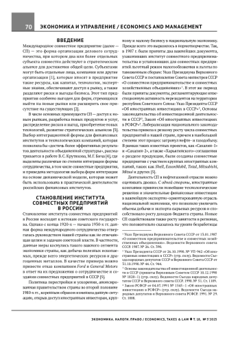 Процессы фрагментации мировой экономики, рост протекционизма и геополитическая нестабильность вынуждают компании искать наиболее эффективные организационные формы международного сотрудничества. Предмет исследования — совместные предприятия как один из инструментов повышения занятости населения в условиях трансформации экономики. Цель работы — определение перспективных зарубежных партнеров и стратегически важных направлений создания совместных предприятий в контексте современных трендов развития мировой экономики. Рассмотрены исторические аспекты зарождения института совместного предпринимательства в России, проблемы его правового регулирования и аспекты национальной безопасности. Проанализировано значение совместных предприятий для приграничных регионов России, в частности Калининградской области. Исследовано сотрудничество в рамках совместных предприятий с Республикой Беларусь как одним из ключевых партнеров по ЕАЭС. Представлены основные направления стратегического партнерства Российской Федерации и КНР, представляющие интерес с позиции создания совместных предприятий. Сделан вывод о необходимости развития института совместного предпринимательства в целях содействия инновационному развитию и повышению конкурентоспособности регионов и страны в целом