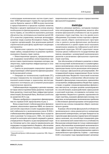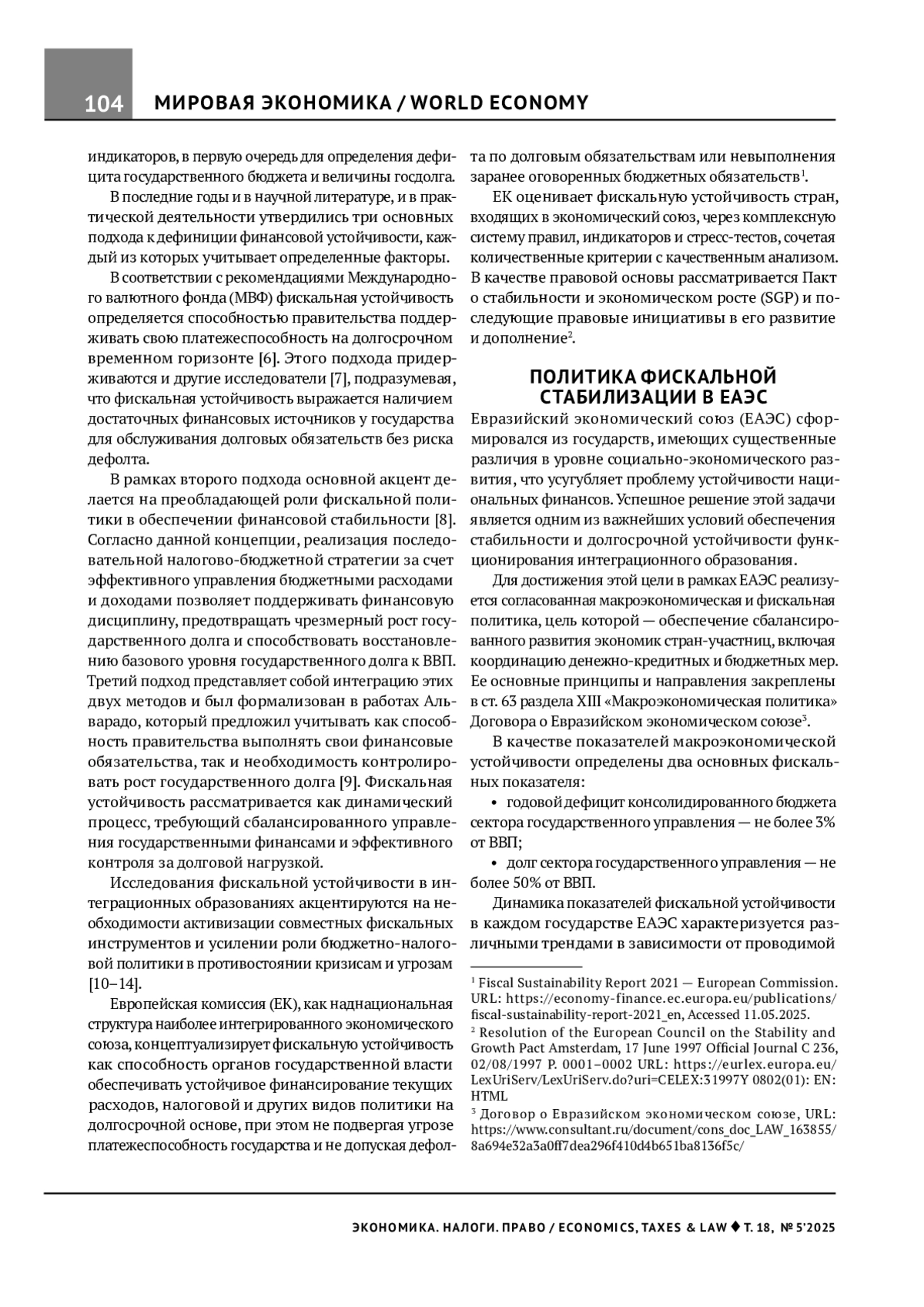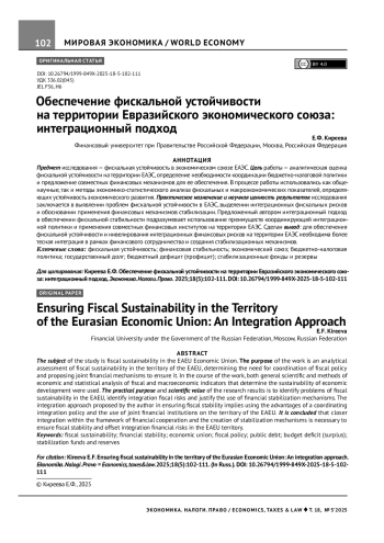 Предмет исследования — фискальная устойчивость в экономическом союзе ЕАЭС. Цель работы — аналитическая оценка фискальной устойчивости на территории ЕАЭС, определение необходимости координации бюджетно-налоговой политики и предложение совместных финансовых механизмов для ее обеспечения. В процессе работы использовались как общенаучные, так и методы экономико-статистического анализа фискальных и макроэкономических показателей, определяющих устойчивость экономического развития. Практическое назначение и научная ценность результатов исследования заключается в выявлении проблем фискальной устойчивости в ЕАЭС, выделении интеграционных фискальных рисков и обосновании применения финансовых механизмов стабилизации. Предложенный автором интеграционный подход в обеспечении фискальной стабильности подразумевает использование преимуществ координирующей интеграционной политики и применения совместных финансовых институтов на территории ЕАЭС. Сделан вывод: для обеспечения фискальной устойчивости и нивелирования интеграционных финансовых рисков на территории ЕАЭС необходима более тесная интеграция в рамках финансового сотрудничества и создания стабилизационных механизмов