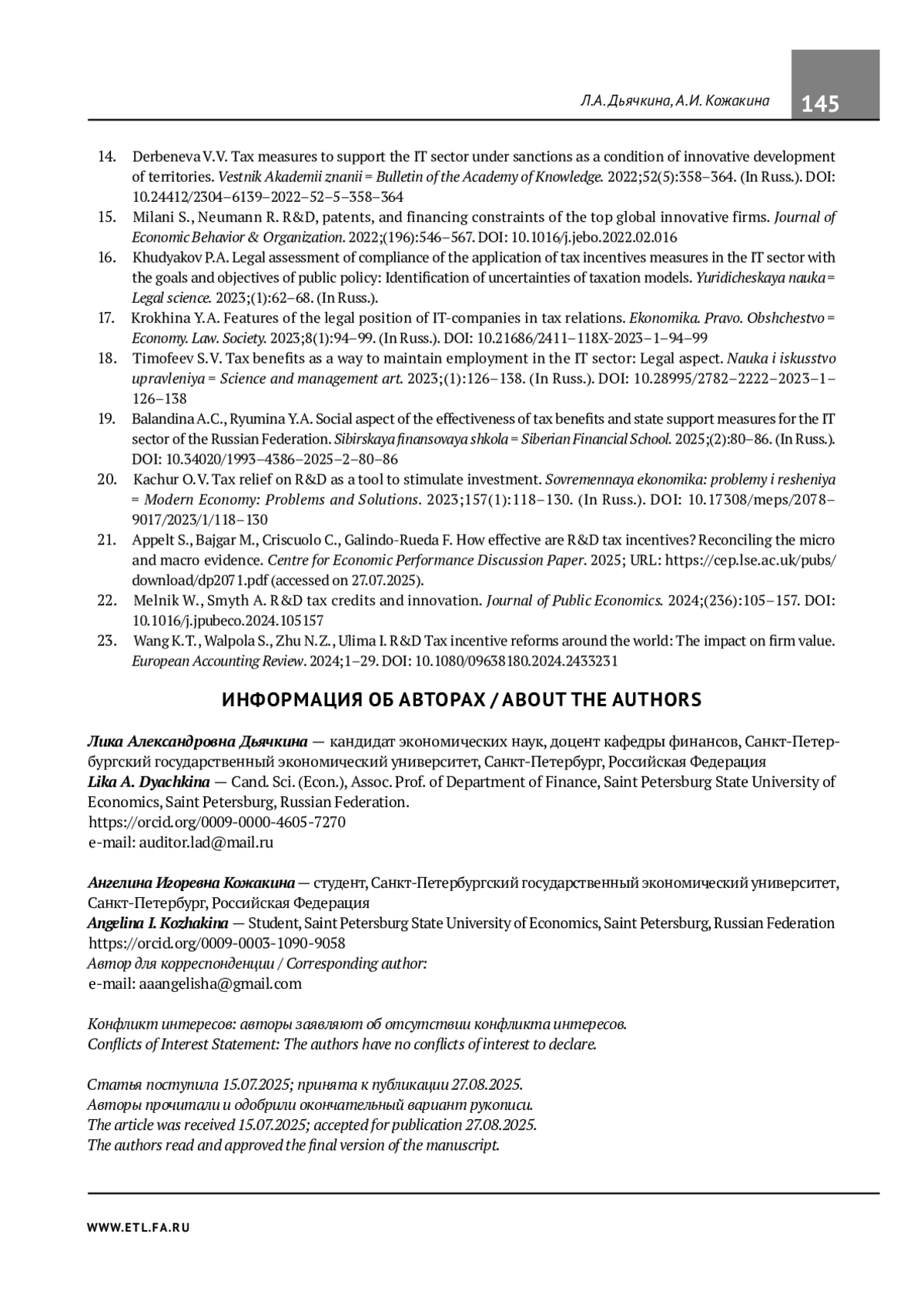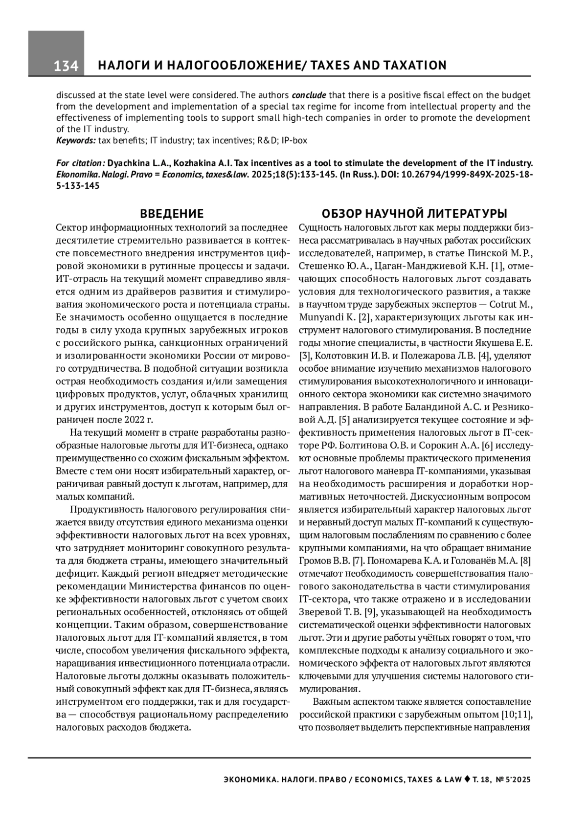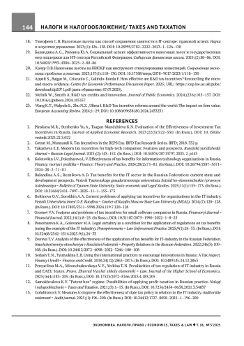 5. Баландина А. С., Резникова А. Д. Налоговые льготы для ИТ-сектора в РФ: современное состояние и перспективы развития. Вестник Тюменского государственного университета. Социально-экономические и правовые исследования. 2025;11(1):155-173. DOI: 10.21684/2411-7897-2025-11-1-155-173 EDN: KDLRAI