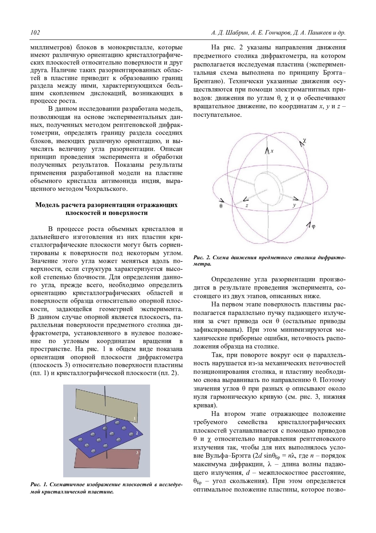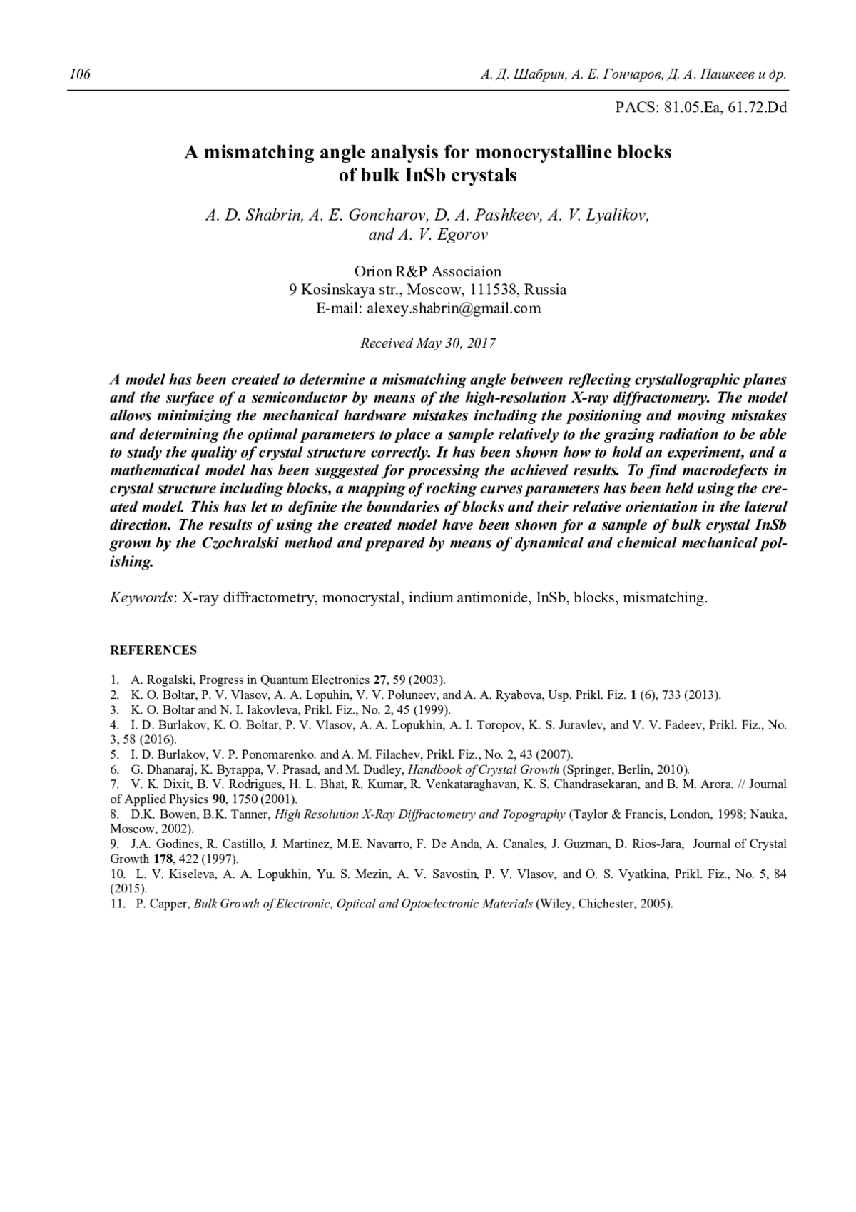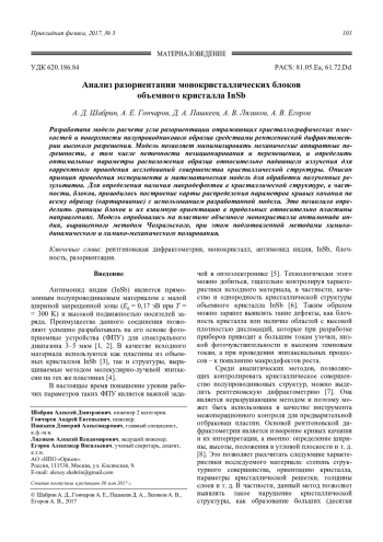 A. D. Shabrin, A. E. Goncharov, D. A. Pashkeev, A. V. Lyalikov, and A. V. Egorov A mismatching angle analysis for monocrystalline blocks of bulk InSb crystals 101