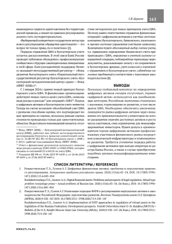 1. Рождественская Т. Э., Гузнов А. Г. Цифровые финансовые активы: проблемы и перспективы правового регулирования. Актуальные проблемы российского права. 2020;115(6):43-54. DOI: 10.17803/1994-1471.2020.115.6.043-054 EDN: EPZAOF