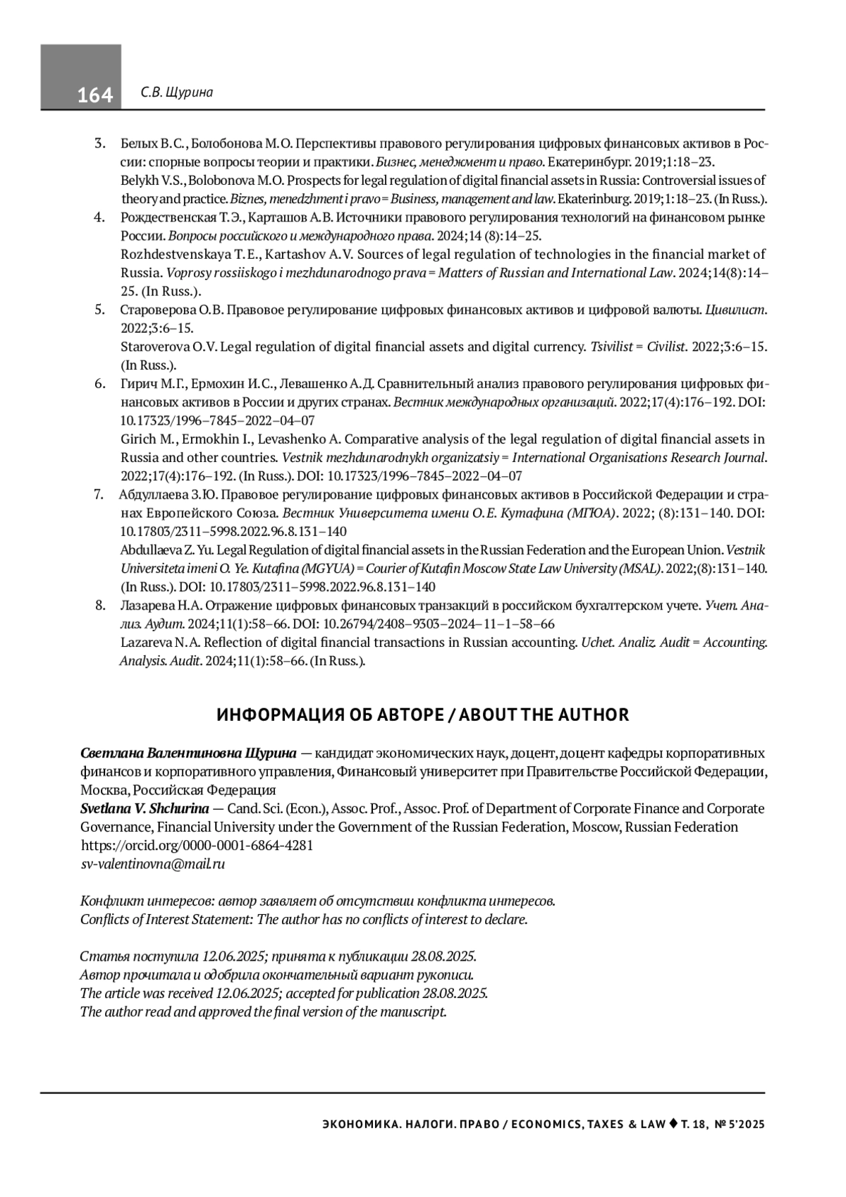5. Староверова О. В. Правовое регулирование цифровых финансовых активов и цифровой валюты. Цивилист. 2022;3:6-15. EDN: DZMSEU