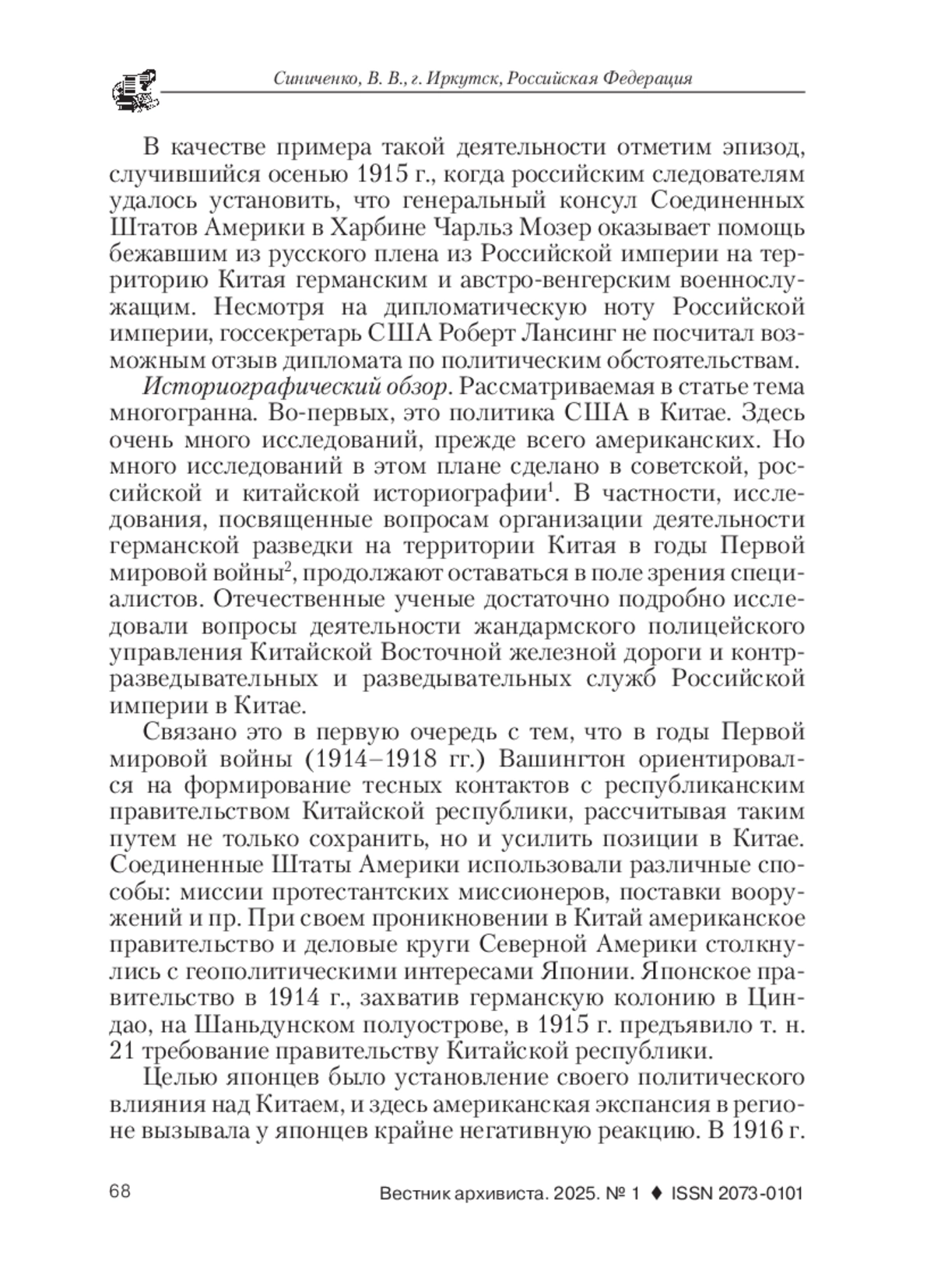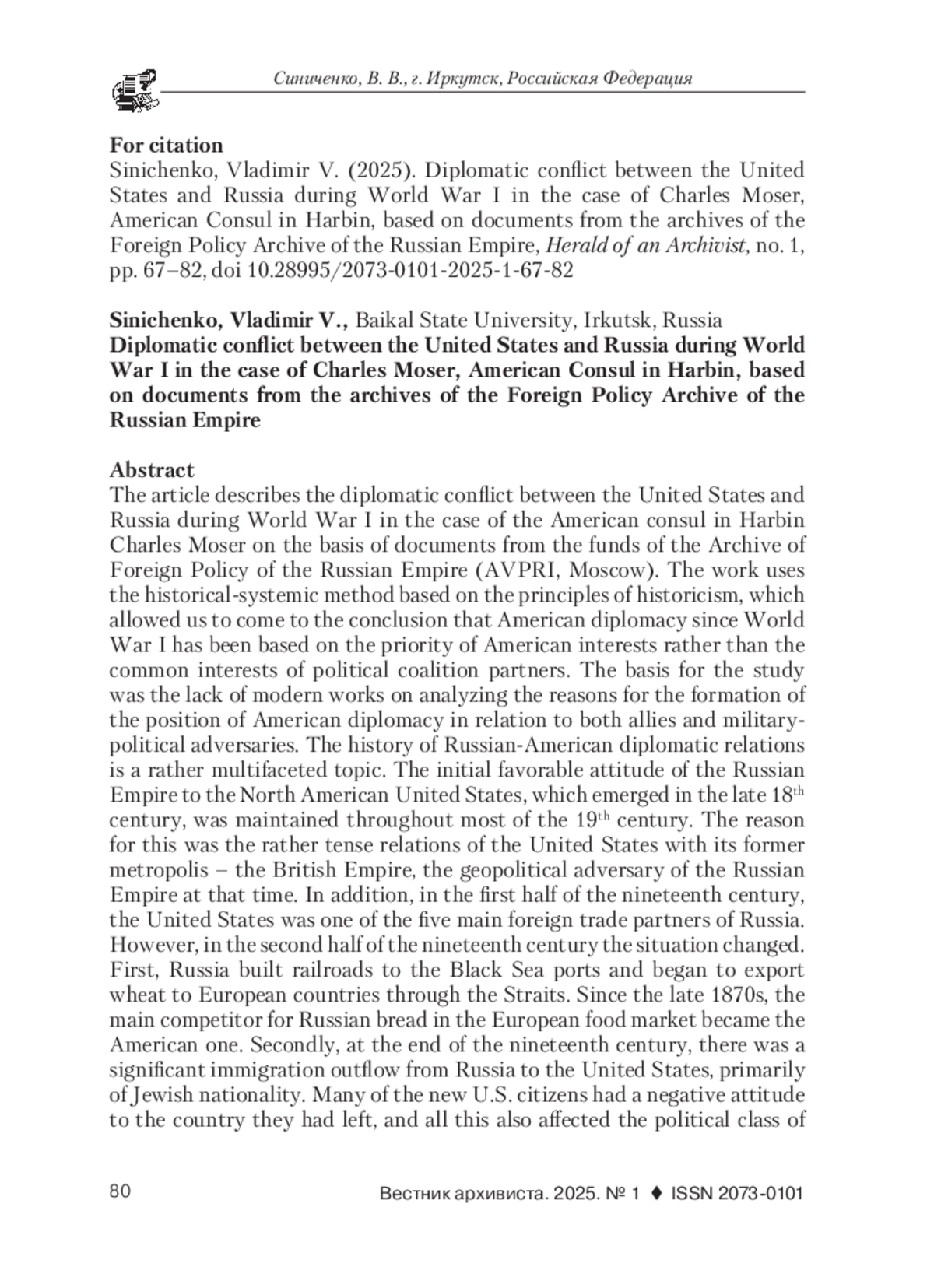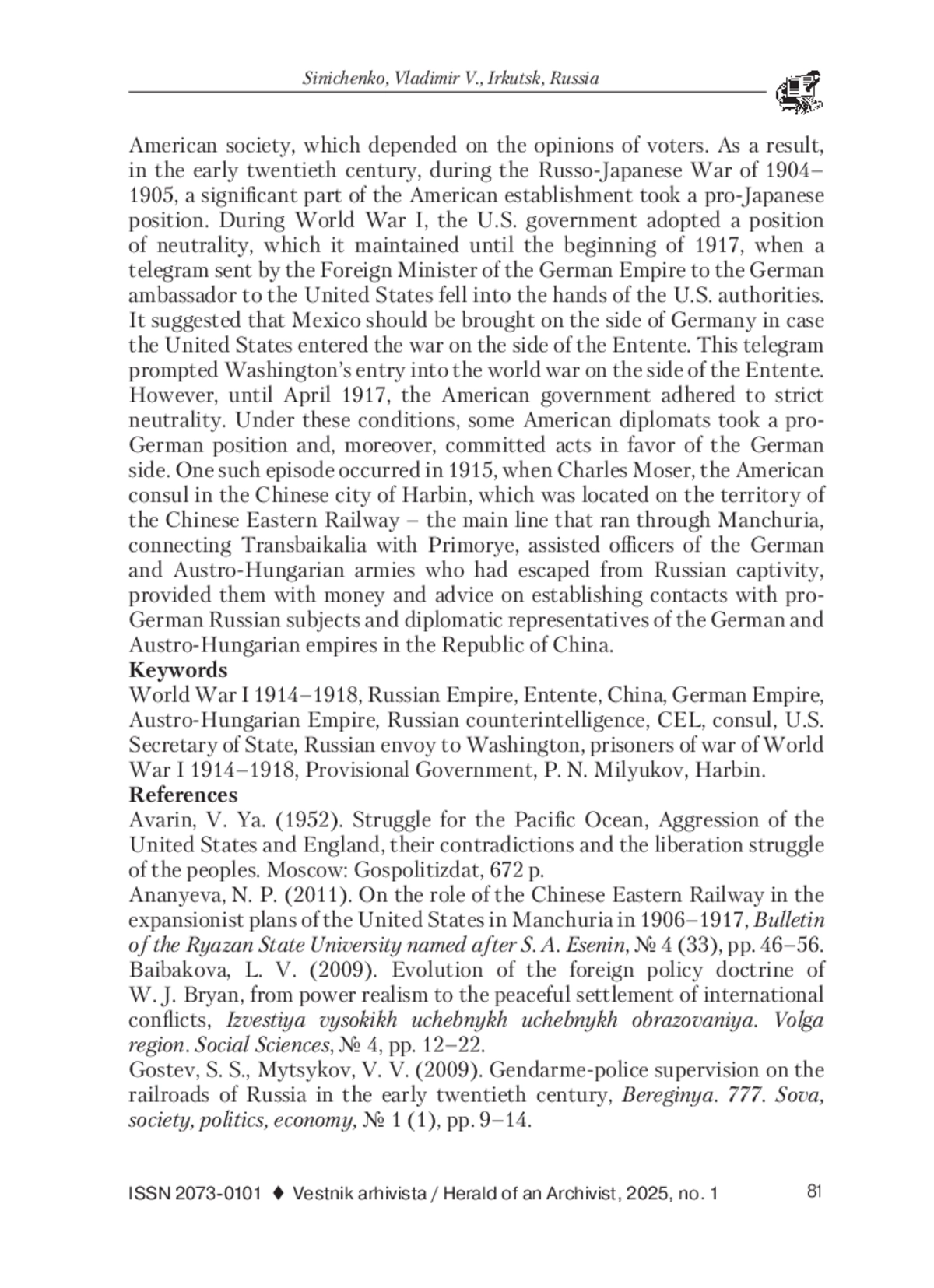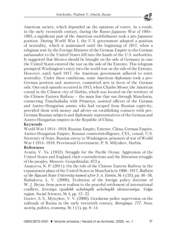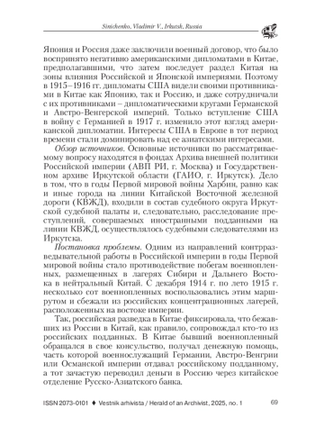 В статье описан дипломатический конфликт США и России в годы Первой мировой войны по делу американского консула в Харбине Чарльза Мозера по документам из фондов Архива внешней политики Российской империи (АВПРИ, г Москва). В работе использован на основе принципов историзма историко-системный метод, который позволил прийти к выводу о том, что в основе американской дипломатии еще со времен Первой мировой войны лежит приоритет американских интересов, а не общих интересов партнеров по политической коалиции. Основанием для проведения исследования послужило отсутствие современных трудов по анализу причин формирования позиции американской дипломатии в отношении как союзников, так и военно-политических противников. История русско-американских дипломатических отношений достаточно многогранная тема. Первоначально благожелательное отношение Российской империи к возникшим в конце ХVIII в. Северо-Американским Соединенным штатам сохранялось на протяжении почти всего ХIХ в. Причиной этого являлось достаточно напряженные отношения США со своей бывшей метрополией - Британской империей, геополитическим противником Российской империи в тот период времени. Кроме того, в первой половине ХIХ в. США входили в пятерку главных внешнеторговых партнеров России. Однако во второй половине ХIХ в. ситуация изменилась. Во-первых, Россия построила железные дороги к черноморским портам и стала через проливы активно вывозить пшеницу в страны Европы. С конца 1870-х гг. главным конкурентом на европейском рынке продовольствия для русского хлеба стал американский. Во-вторых, в конце ХIХ в. из России в США начался значительный иммиграционный отток лиц прежде всего еврейской национальности. Многие из новых граждан США негативно относились к стране, которую они покинули, все это накладывало отпечаток и на политический класс американского общества, зависевшего от мнений избирателей. В результате в начале ХХ в. в период Русско-японской войны 1904-1905 гг. значительная часть американского истеблишмента занимала прояпонскую позицию. В годы Первой мировой войны правительство США заняло позицию нейтралитета, которую сохраняло до начала 1917 г., пока в руки американских властей не попала телеграмма, посланная министром иностранных дел Германской империи германскому послу в США. В ней предлагалось привлечь Мексику на сторону Германии в случае вступления США в войну на стороне Антанты. Эта телеграмма послужила поводом для вступления Вашингтона в мировую войну на стороне Антанты. Однако до апреля 1917 г. американское правительство придерживалось строгого нейтралитета. В этих условиях часть американских дипломатов занимала прогерманскую позицию и, более того, совершала действия в пользу германской стороны. Один из таких эпизодов произошел в 1915 г., когда Чарльз Мозер, американский консул в китайском городе Харбин, который располагался на территории Китайской Восточной железной дороги - магистрали, проходившей по Маньчжурии и соединявшей Забайкалье с Приморьем, оказывал содействие бежавшим из русского плена офицерам германской и австро-венгерской армий, снабжал их деньгами и рекомендациями по установлению контактов с прогермански настроенными русскими подданными и дипломатическими представителями Германской и Австро-Венгерской империй в Китайской Республ