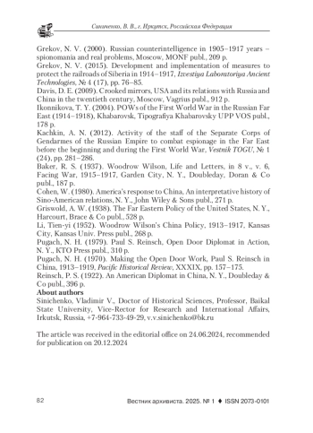 9. Качкин, А. Н. Деятельность сотрудников Отдельного корпуса жандармов Российской империи по борьбе со шпионажем на Дальнем Востоке перед началом и в годы Первой мировой войны // Вестник ТОГУ. 2012. № 1 (24). С. 281-286.