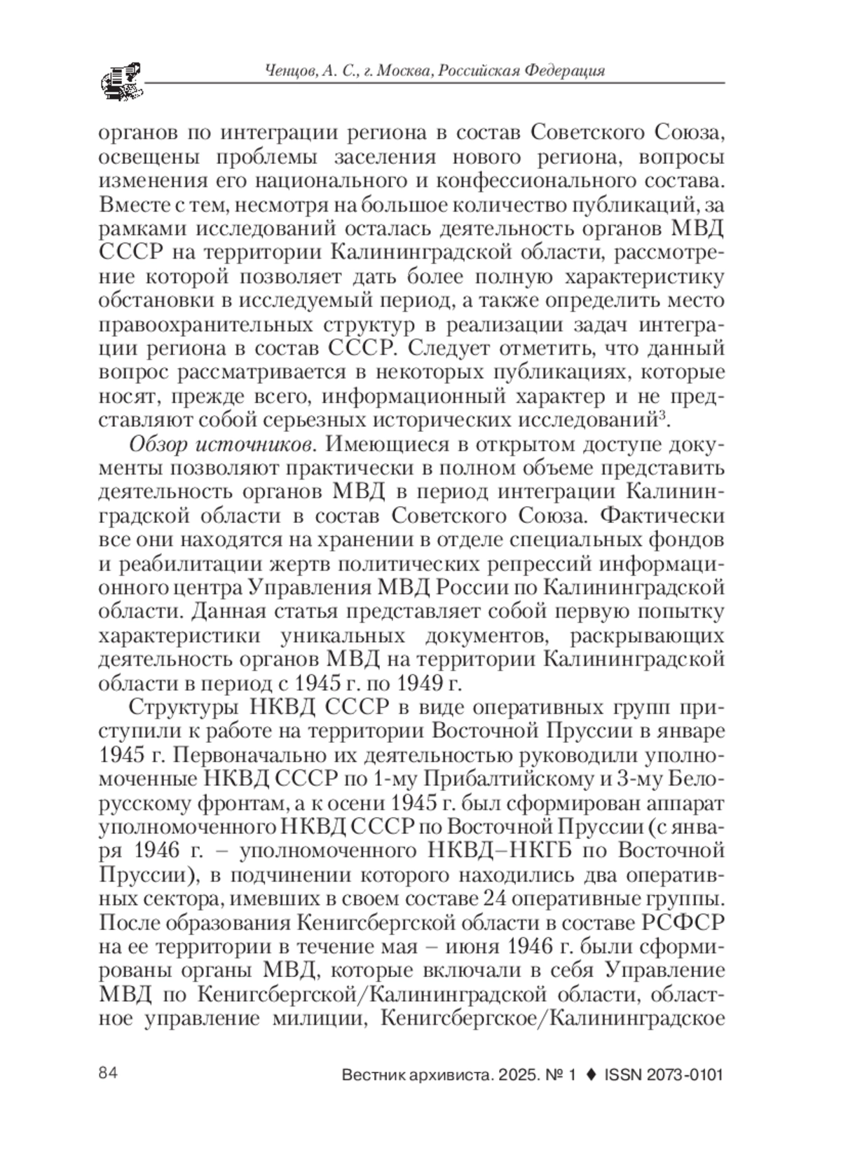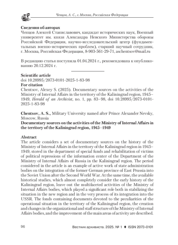 В статье рассмотрен комплекс документальных источников по истории органов МВД на территории Калининградской области в 1945-1949 гг., находящихся на хранении в отделе специальных фондов и реабилитации жертв политических репрессий информационного центра Управления МВД России по Калининградской области. Рассмотренный в статье период представляет собой пример активной работы органов государственного управления по интеграции бывшей германской провинции Восточная Пруссия в состав Советского Союза по итогам Второй мировой войны. Вместе с тем имеющиеся исторические исследования, в которых практически полностью рассмотрена ранняя история Калининградской области, оставляют за рамками многогранную деятельность органов МВД, сыгравших значительную роль как в стабилизации обстановки на территории нового региона, так и в самом процессе его интеграции в состав СССР. Описаны фонды, содержащие документы, посвященные особенностям оперативной обстановки на территории Калининградской области, созданию и изменению организационно-штатной структуры органов МВД, совершенствованию основных направлений деятельности. Особое внимание уделено анализу документов, касающихся одного из элементов интеграции региона в состав Советского Союза - выселения немецкого населения в советскую зону оккупации Германии в 1947-1948 гг. Рассмотрены особенности статистической отчетности органов МВД за 1946-1949 гг., позволяющей выявить особенности криминогенной ситуации о области, эффективность проводимой следственной работы, а также характеристику лиц, совершавших преступления. Дана характеристика фондов, касающаяся деятельности ряда структурных подразделений Управления МВД по Калининградской области и их периферийных органов. Определены особенности архивной коллекции, связанной с отсутствием материалов, касающихся деятельности органов милиции в исследуемый период и работы периферийных структур Управления МВД по Калининградской области, а также ограниченным доступом к отдельным делам и документам. В заключение сделан вывод о том, что документы архивной коллекции Управления МВД России по Калининградской области являются ценнейшим источником по ранней истории региона, введение которых в научный оборот позволит уточнить многие вопросы, касающиеся проблем интеграции территорий, вошедших в состав СССР по итогам Второй мировой войны.