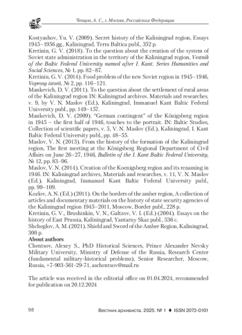 7. Кретинин, Г. В. К вопросу о создании системы советского государственного управления на территории Калининградской области // Вестник Балтийского федерального университета им. И. Канта. Серия: Гуманитарные и общественные науки. 2018. № 1. С. 82-87. EDN: YXHTIF