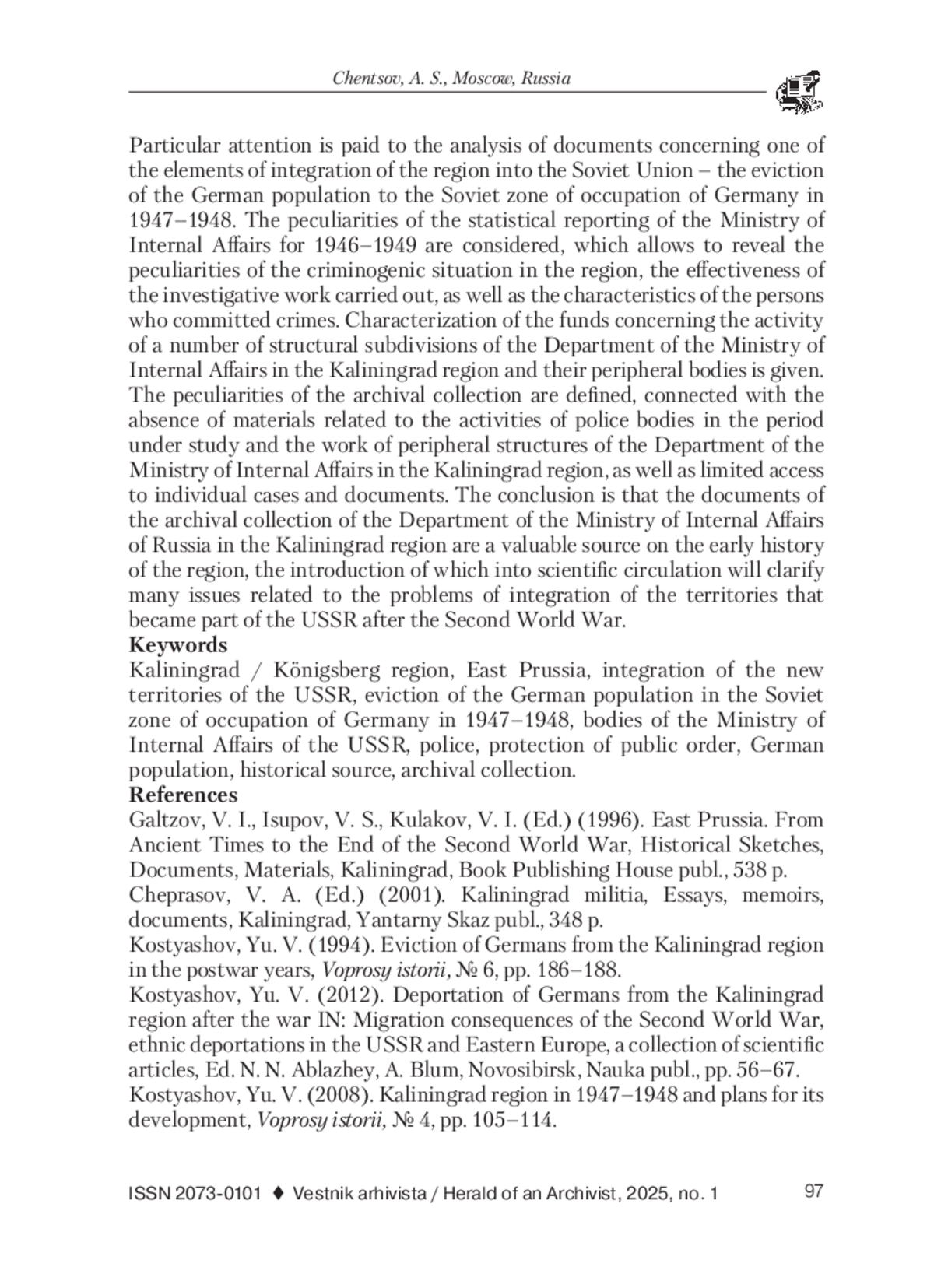 3. Костяшов, Ю. В. Выселение немцев из Калининградской области в послевоенные годы // Вопросы истории. 1994. № 6. С. 186-188.