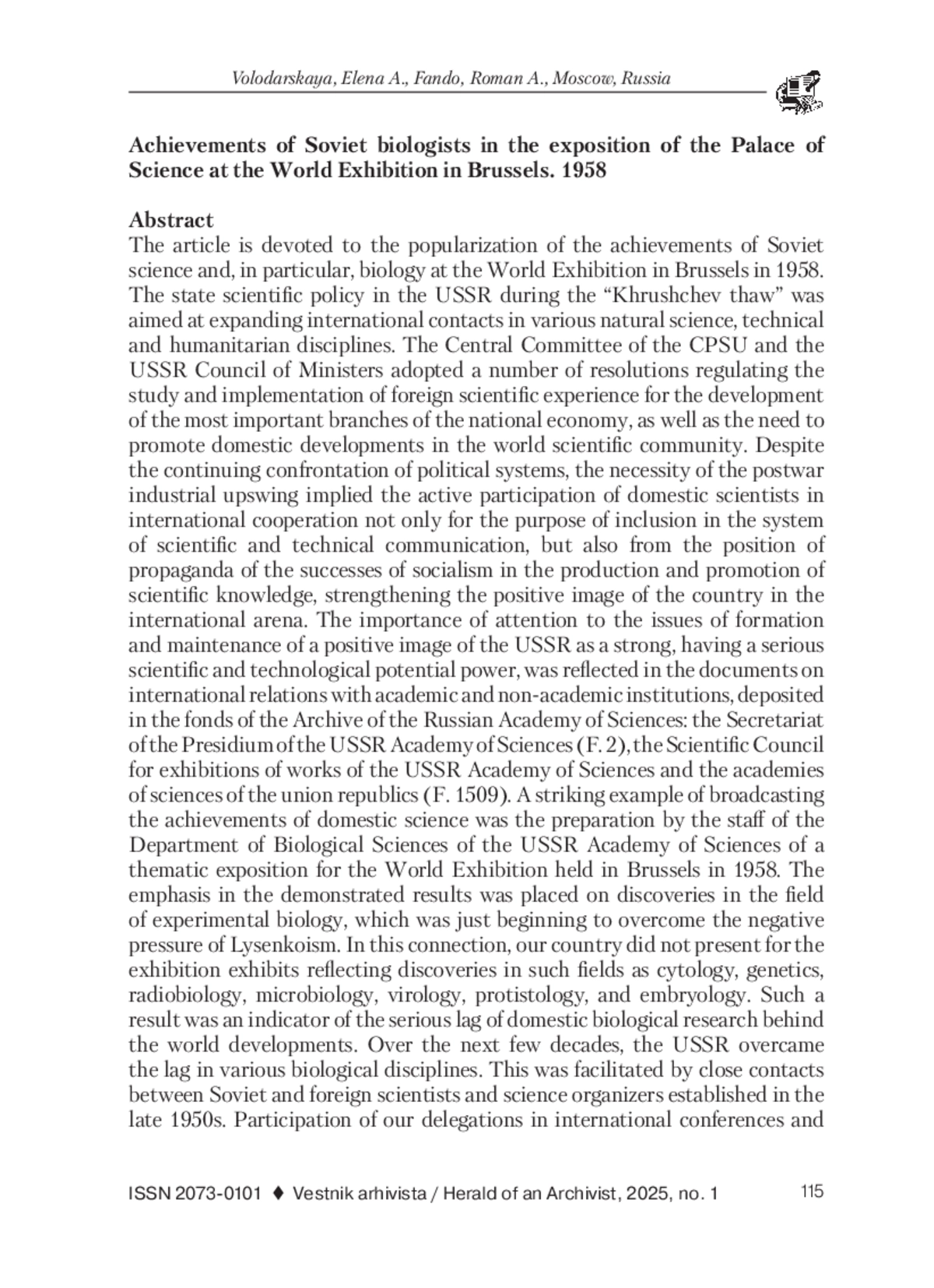 Статья посвящена популяризации достижений советской науки, и в частности биологии, на Всемирной выставке в Брюсселе в 1958 г. Государственная научная политика в СССР в период «хрущевской оттепели» была направлена на расширение международных контактов в различных естественнонаучных, технических и гуманитарных дисциплинах. Центральный Комитет КПСС и Совет министров СССР приняли ряд постановлений, регламентирующих изучение и внедрение зарубежного научного опыта в целях развития важнейших отраслей народного хозяйства, а также необходимость продвижения отечественных разработок в среде мирового научного сообщества. Несмотря на продолжающееся противостояние политических систем, необходимость послевоенного промышленного подъема предполагала активное участие отечественных ученых в международном сотрудничестве не только с целью включения в систему научно-технической коммуникации, но и с позиции пропаганды успехов социализма в производстве и продвижении научного знания, усиления положительного имиджа страны на международной арене. Значимость внимания к вопросам формирования и поддержания позитивного образа СССР как сильной, имеющей серьезный научно-технологический потенциал державы, нашла отражение в документах по вопросам международных связей с академическими и неакадемическими учреждениями, отложившихся в фондах Архива Российской академии наук: Секретариата Президиума АН СССР (Ф. 2), Научного совета по выставкам работ АН СССР и академий наук союзных республик (Ф. 1509). Ярким примером трансляции достижений отечественной науки стала подготовка сотрудниками Отделения биологических наук АН СССР тематической экспозиции для Всемирной выставки, проходившей в 1958 г. в Брюсселе. Акцент в демонстрируемых результатах был сделан на открытиях в области экспериментальной биологии, которая только начала преодолевать негативное давление лысенковщины. В связи с этим наша страна не представила для выставки экспонаты, отражающие открытия в таких областях, как цитология, генетика, радиобиология, микробиология, вирусология, протистология, эмбриология. Подобный результат стал показателем серьезного отставания отечественных биологических исследований от мировых разработок. На протяжении нескольких последующих десятилетий СССР преодолевал отставание в различных биологических дисциплинах. Этому способствовали установившиеся в конце 1950-х гг. тесные контакты между советскими и зарубежными учеными и организаторами науки. Участие наших делегаций в международных конференциях и выставках позволяло не только знакомиться с прорывными открытиями в области биологии, новыми физико-химическими методами, но и помогало поднимать авторитет советской науки, транслировать ее результаты, определять стратегии будущего развития.