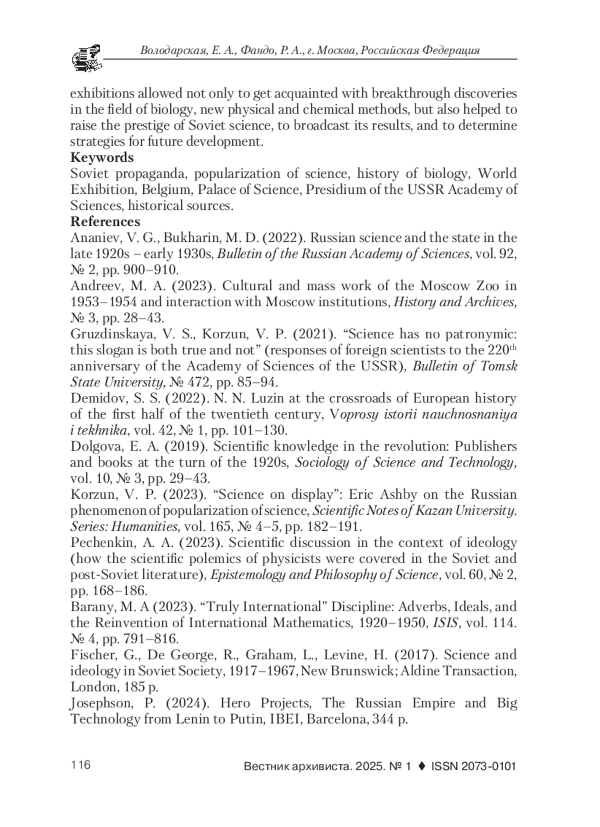 1. Ананьев, В. Г., Бухарин, М. Д. Российская наука и государство в конце 1920-х - начале 1930-х годов // Вестник Российской академии наук. 2022. Т. 92. № 2. С. 900-910. EDN: SPMUKO