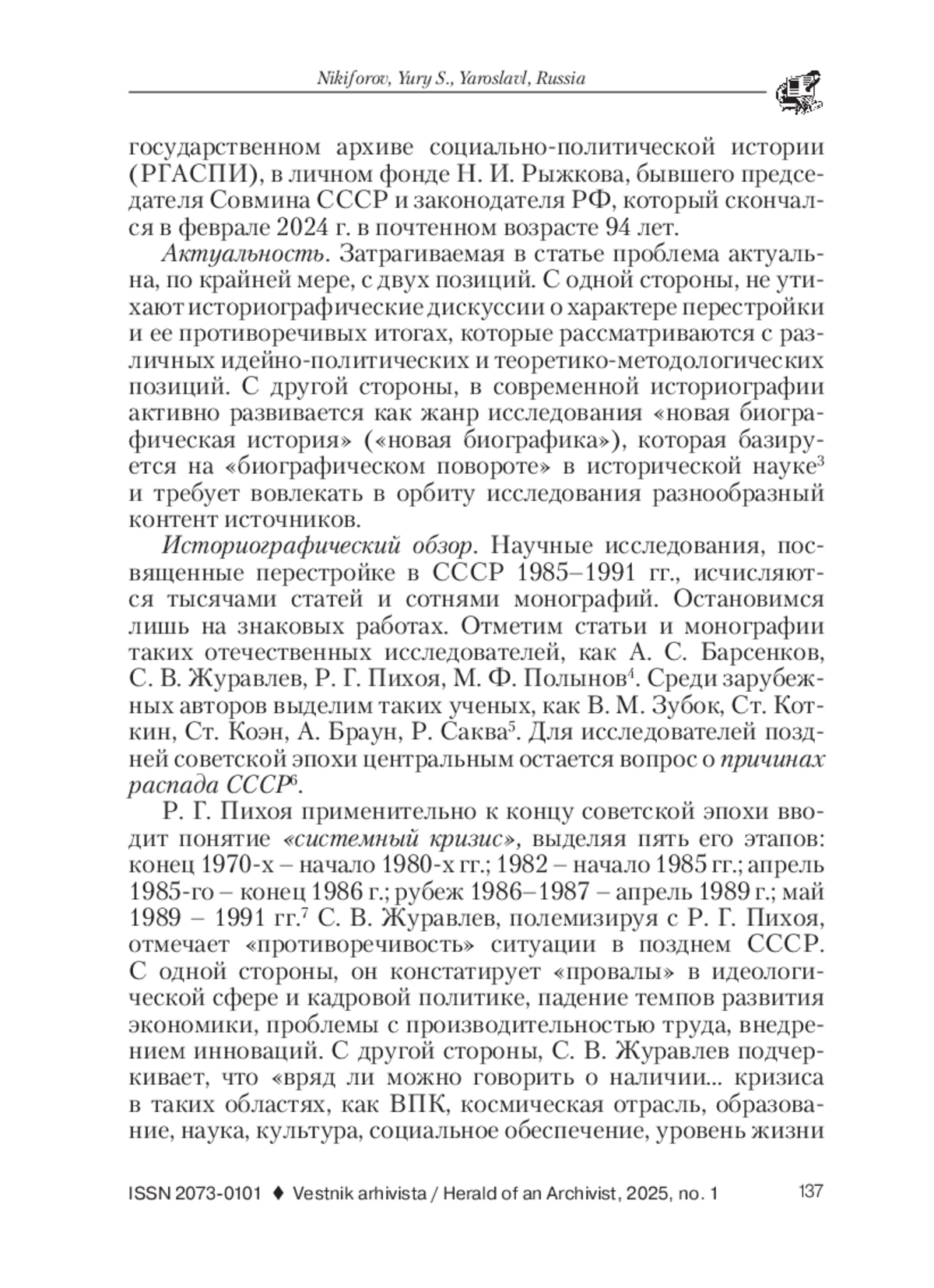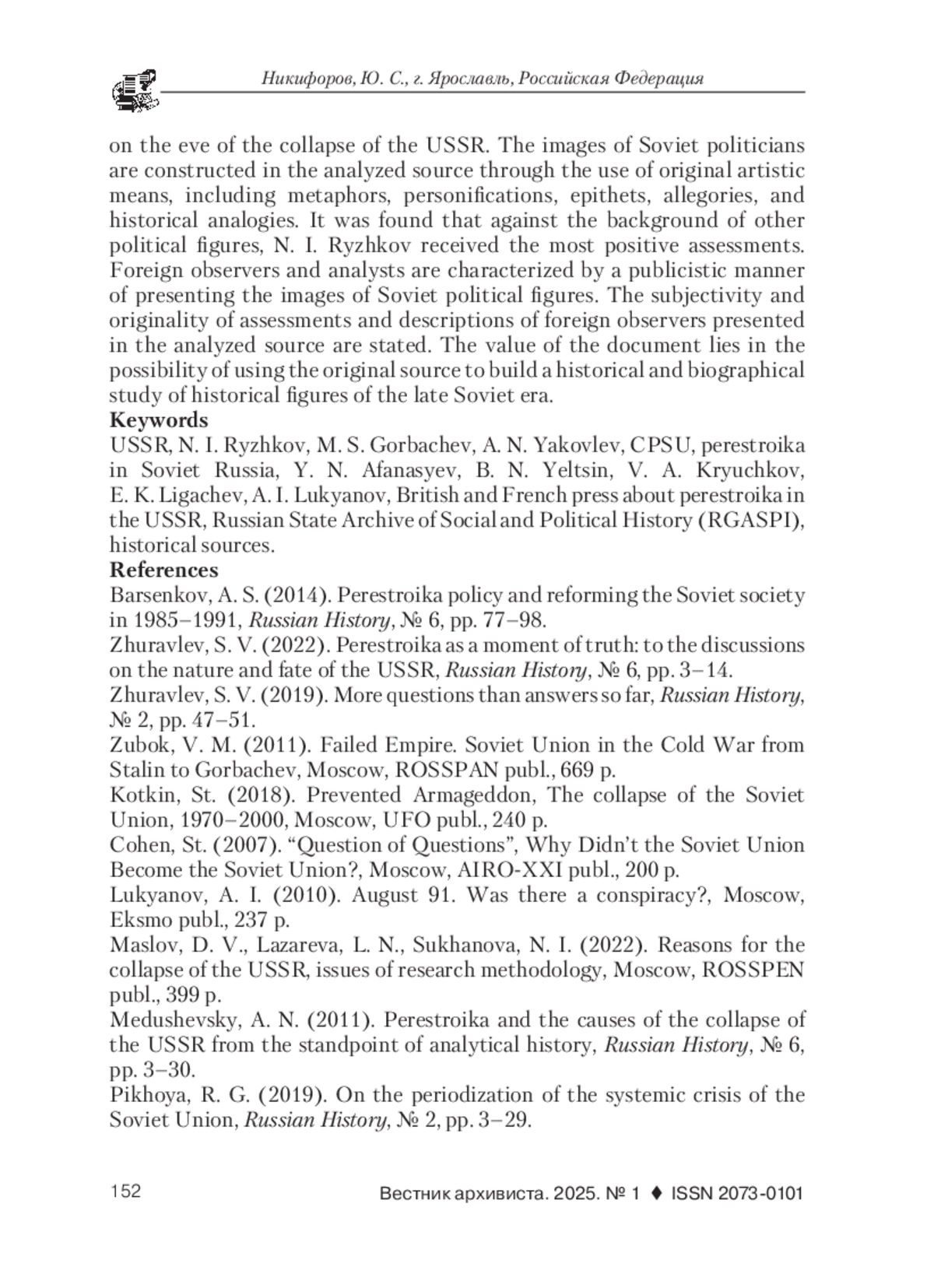 2. Журавлев, С. В. Перестройка как момент истины: к дискуссиям о природе и судьбе СССР // Российская история. 2022. № 6. С. 3-14. EDN: MKWEFO