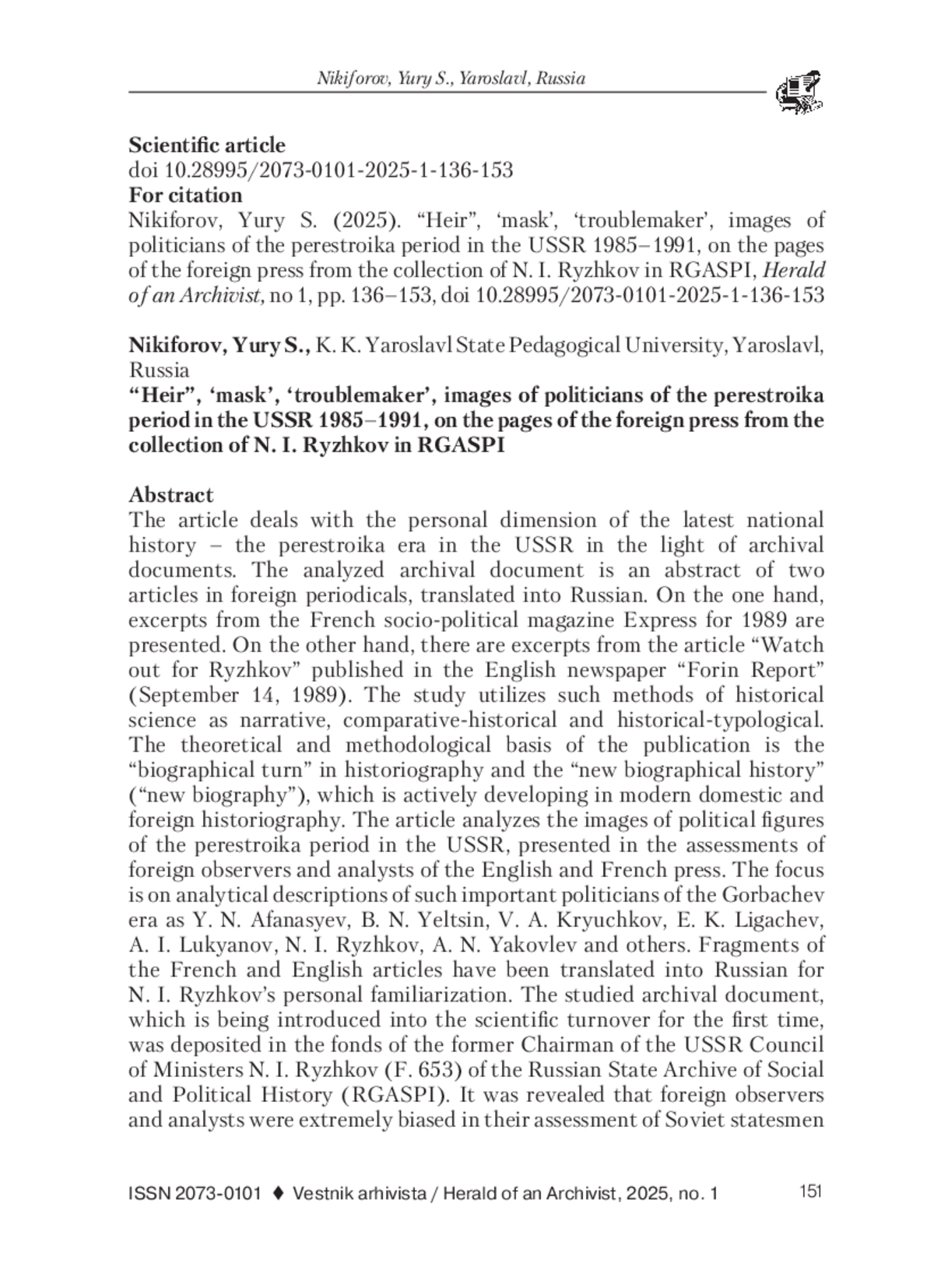 В статье имеет место обращение к персональному измерению новейшей отечественной истории - эпохе перестройки в СССР в свете архивных документов. Анализируемый архивный документ представляет собой реферат двух статей в зарубежной периодической печати, переведенный на русский язык. С одной стороны, представлены выдержки из французского общественно-политического журнала «Экспресс» за 1989 г. С другой стороны, имеются выдержки из статьи «Следите за Рыжковым», опубликованной в английской газете «Форин рипорт» (от 14 сентября 1989 г.). В исследовании использованы такие методы исторической науки, как нар- ративный, сравнительно-исторический и историко-типологический. Теоретико-методологической основой публикации является «биографический поворот» в историографии и «новая биографическая история» («новая биографика»), которая активно развивается в современной отечественной и зарубежной историографии. Анализируются образы политических деятелей периода перестройки в СССР, представленные в оценках зарубежных наблюдателей и аналитиков английской и французской прессы. В центре внимания находятся аналитические описания таких важнейших политиков эпохи М. С. Горбачева, как Ю. Н. Афанасьев, Б. Н. Ельцин, В. А. Крючков, Е. К. Лигачев, А. И. Лукьянов, Н. И. Рыжков, А. Н. Яковлев, и других. Фрагменты французской и английской статей переведены на русский язык для личного ознакомления Н. И. Рыжкова. Изучаемый архивный документ, который впервые вводится в научный оборот, отложился в фонде бывшего председателя Совета министров СССР Н. И. Рыжкова (Ф. 653) Российского государственного архива социально-политической истории (РГАСПИ). Выявлено, что зарубежные наблюдатели и аналитики крайне тенденциозно оценивали советских государственных деятелей накануне распада СССР. Образы советских политиков конструируются в анализируемом источнике посредством применения оригинальных художественных средств, включая метафоры, олицетворения, эпитеты, аллегории, исторические аналогии. Установлено, что на фоне других политических деятелей наиболее позитивных оценок удостаивается Н. И. Рыжков. Для зарубежных наблюдателей и аналитиков характерна публицистическая манера подачи образов советских политических деятелей. Констатируется субъективность и оригинальность оценок и описаний зарубежных наблюдателей, представленных в анализируемом источнике. Ценность документа заключается в возможности использования оригинального источника для построения историко-биографического исследования исторических деятелей конца советской эпохи.