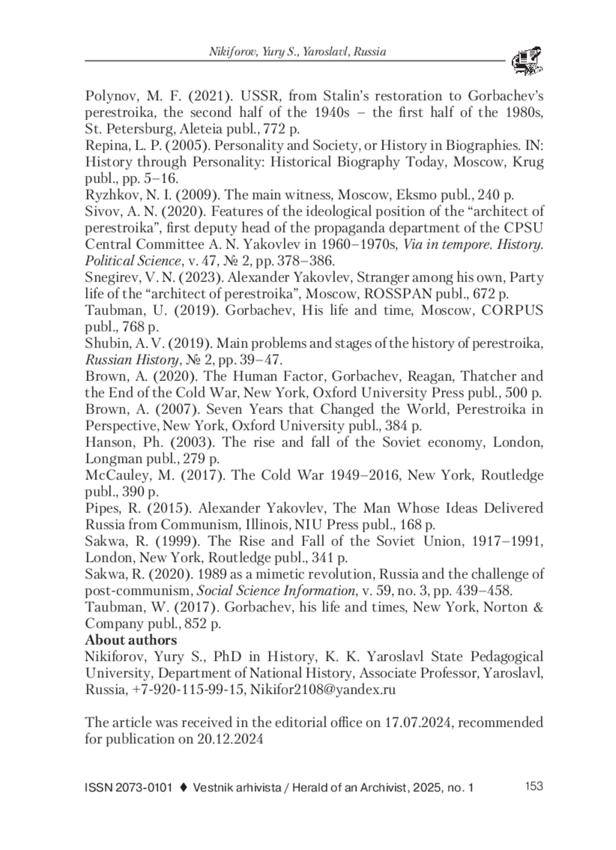 18. Brown, A. (2020). The Human Factor, Gorbachev, Reagan, Thatcher and the End of the Cold War, New York, Oxford University Press publ., 500 p.