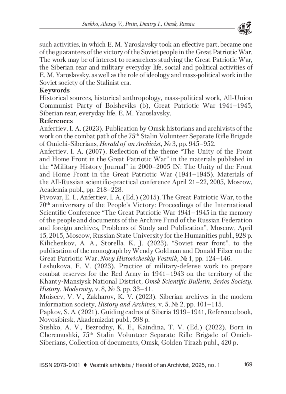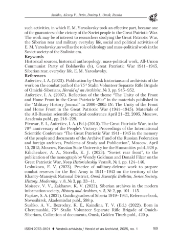 1. Анфертьев, И. А. Издание омскими историками и архивистами труда о боевом пути 75-й Сталинской добровольческой отдельной стрелковой бригады омичей-сибиряков // Вестник архивиста. 2023. № 3. С. 945-952. EDN: ALCLIN