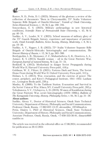 9. Ростов, Н. Д., Петин, Д. И. Памяти славных: рецензия на сборник документов “Рождённая в Черёмушках: 75-я Сталинская добровольческая отдельная стрелковая бригада омичей-сибиряков” // Вестник Омского университета. Серия: Исторические науки. 2023. Т. 10. № 3. С. 188-194. EDN: VIVTPH
