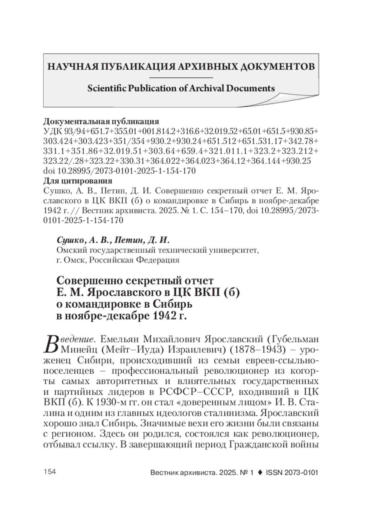 Введение. Емельян Михайлович Ярославский (Губельман Минейц (Мейт–Иуда) Израилевич) (1878–1943) – уроженец Сибири, происходивший из семьи евреев-ссыльнопоселенцев – профессиональный революционер из когорты самых авторитетных и влиятельных государственных и партийных лидеров в РСФСР–СССР, входивший в ЦК ВКП (б). К 1930-м гг. он стал «доверенным лицом» И. В. Сталина и одним из главных идеологов сталинизма. Ярославский хорошо знал Сибирь. Значимые вехи его жизни были связаны с регионом. Здесь он родился, состоялся как революционер, отбывал ссылку.