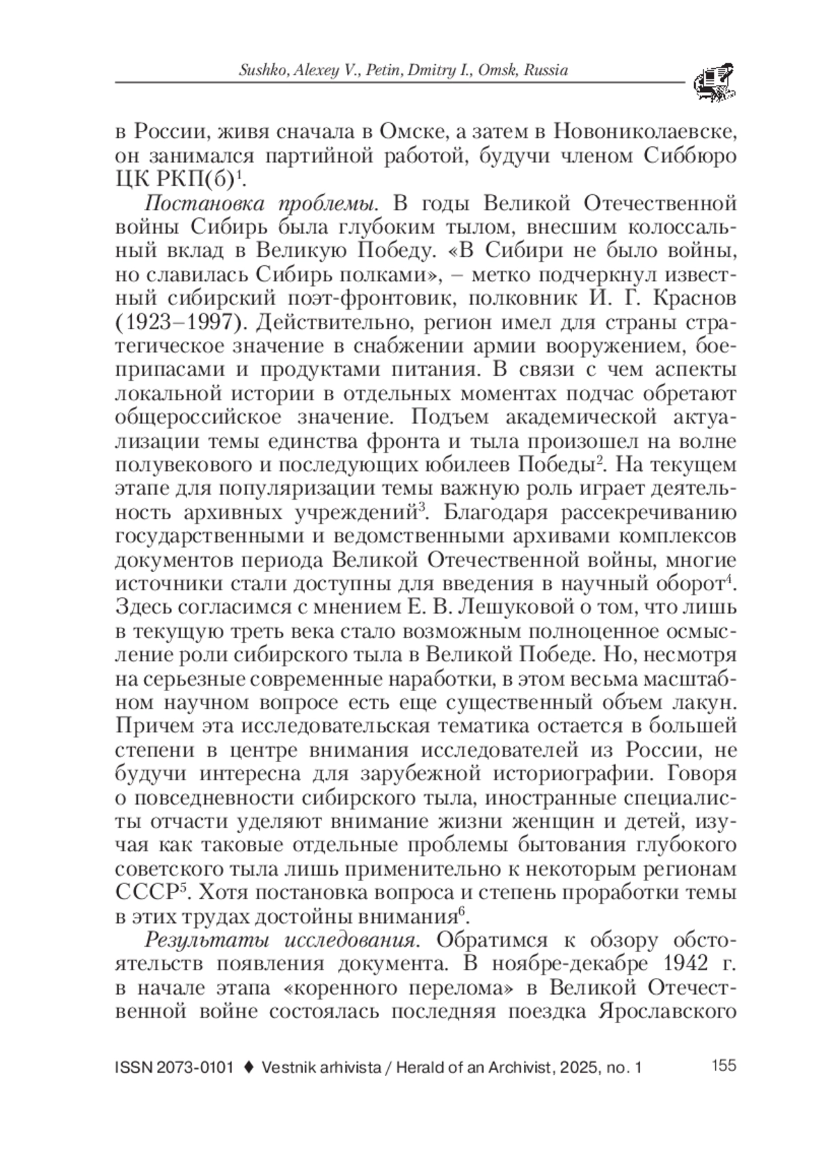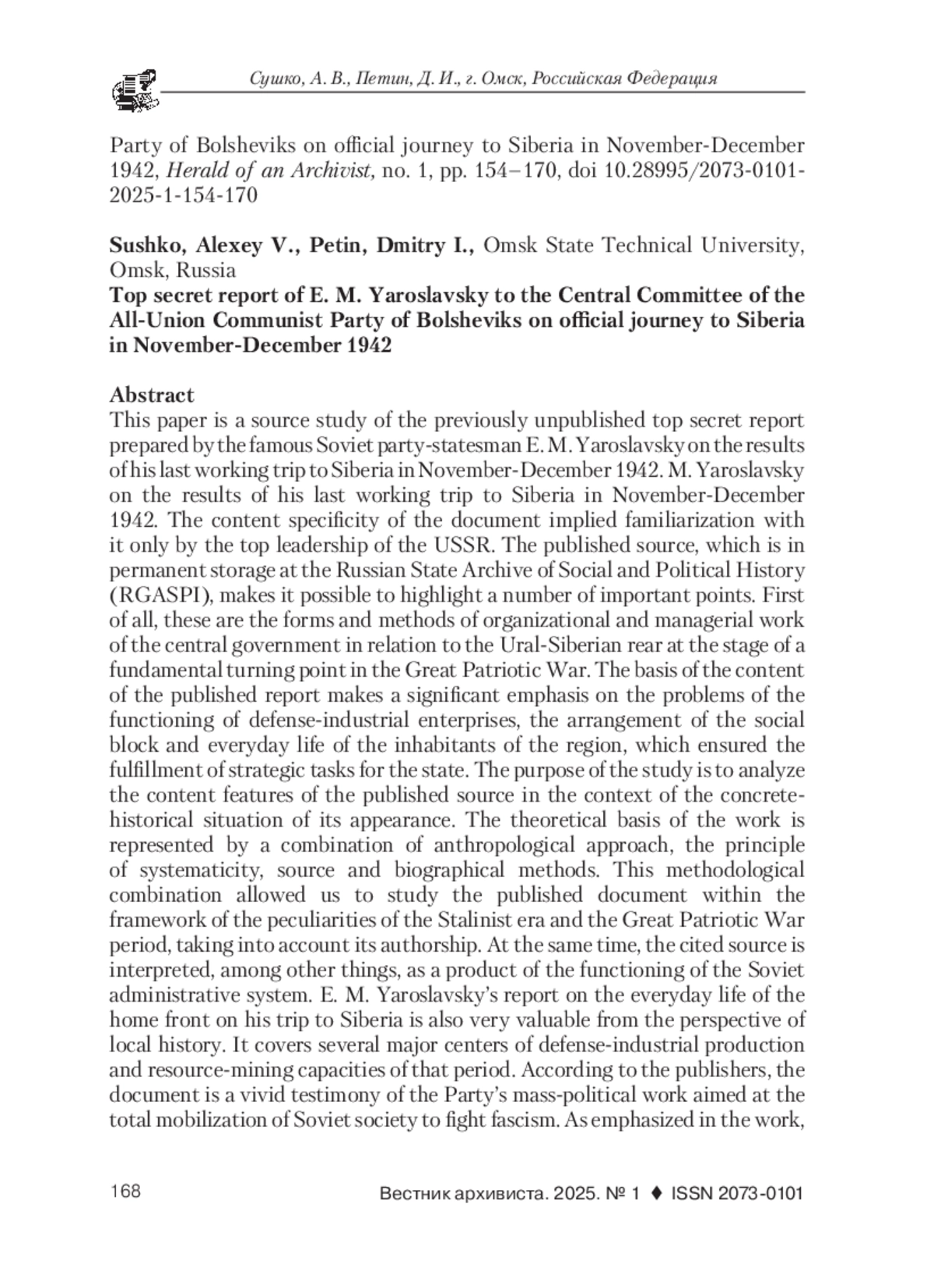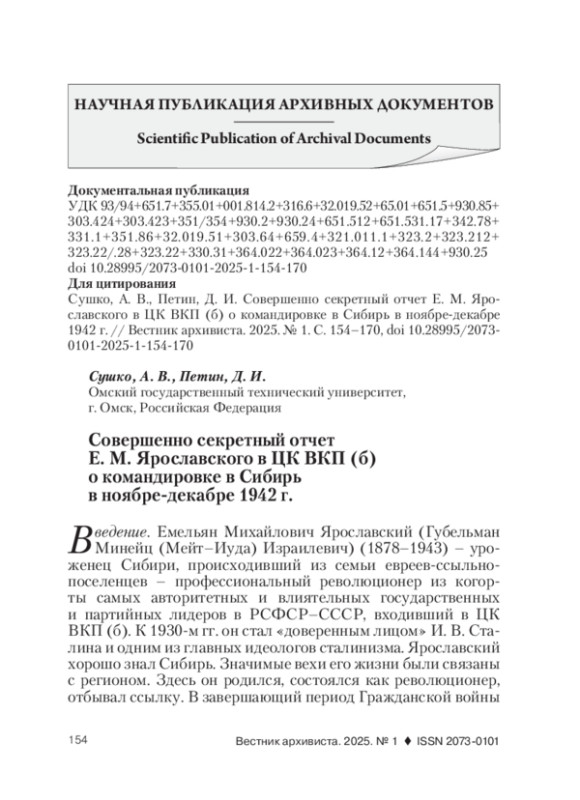 В работе проведено источниковедческое исследование не публиковавшегося ранее совершенно секретного отчета, подготовленного известным советским партийно-государственным деятелем Е. М. Ярославским по итогам его последней рабочей поездки в Сибирь в ноябре-декабре 1942 г. Содержательная специфика документа предполагала ознакомление с ним только высшего руководства СССР. Публикуемый источник, находящийся на постоянном хранении в Российском государственном архиве социально-политической истории (РГАСПИ), позволяет осветить ряд важных моментов. Прежде всего, это формы и методы организационно-управленческой работы центральной власти по отношению к урало-сибирскому тылу на этапе коренного перелома в Великой Отечественной войне. Основа содержания публикуемого отчета делает значительный акцент на проблемах функционирования оборонно-промышленных предприятий, устройстве социального блока и повседневной жизни жителей региона, обеспечивавших выполнение стратегических для государства задач. Цель исследования заключена в анализе содержательных особенностей публикуемого источника в контексте конкретно-исторической обстановки его появления. Теоретическая основа работы представлена сочетанием антропологического подхода, принципа системности, источниковедческого и биографического методов. Данная методологическая совокупность позволила в рамках особенностей эпохи сталинизма и периода Великой Отечественной войны исследовать публикуемый документ с учетом его авторства. При этом приводимый источник интерпретируется, в том числе, и как продукт функционирования советской административной системы. Отчет Е. М. Ярославского, повествующий о повседневной жизни тыла в Сибири, весьма ценен также с позиций локальной истории. Он обзорно охватывает сразу несколько крупных центров оборонно-промышленного производства и ресурсно-добывающих мощностей того периода. По мнению публикаторов, документ является ярким свидетельством партийной массово-политической работы, направленной на тотальную мобилизацию советского общества для борьбы с фашизмом. Как подчеркивается в работе, такая деятельность, в которой действенное участие принял Е. М. Ярославский, стала одним из залогов Победы советского народа в Великой Отечественной войне. Работа может представлять интерес для исследователей, изучающих Великую Отечественную войну, сибирский тыл и военную повседневность, общественно-политическую деятельность Е. М. Ярославского, а также роль идеологии и массово-политической работы в советском обществе эпохи сталинизма.