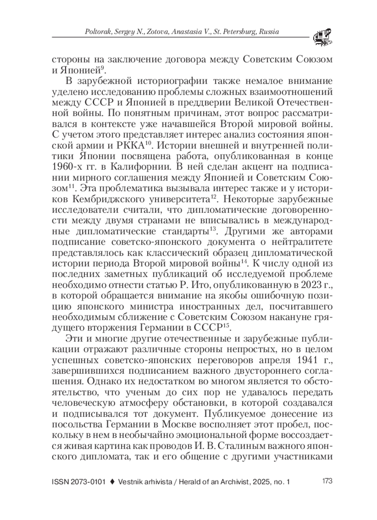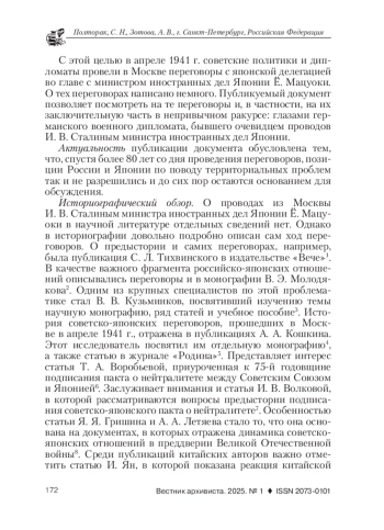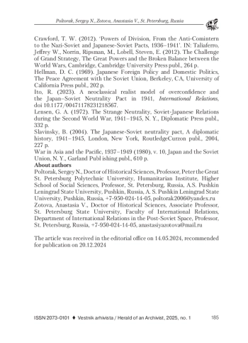 2. Воробьева, Т. А. СССР и Япония - год 1941 (к 75-летию пакта о нейтралитете) // Международные отношения в ХХ веке. Сборник научных статей, Киров, 11 апреля 2016 г. Вып. 4. Киров: Радуга-ПРЕСС, 2016. С. 156-171. EDN: WCYAOH