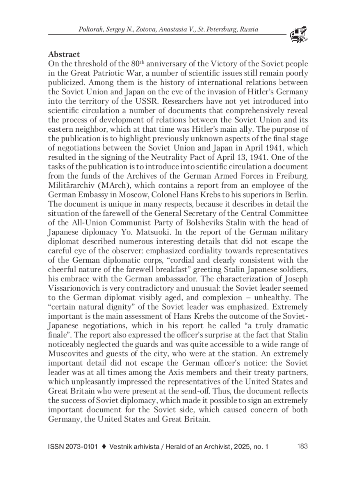 В преддверии 80-летнего юбилея Победы советского народа в Великой Отечественной войне ряд научных вопросов до сих пор остается мало освещенным. В их числе находится история международных отношений Советского Союза с Японией накануне вторжения гитлеровской Германии на территорию СССР. Исследователи до сих пор не ввели в научный оборот ряд документов, всесторонне раскрывающих процесс развития взаимоотношений между Советским Союзом и ее восточным соседом, бывшим в то время главным союзником Гитлера. Цель публикации - осветить ранее неизвестные стороны завершающего этапа переговоров между Советским Союзом и Японией в апреле 1941 г., результатом которых было подписание пакта о нейтралитете от 13 апреля 1941 г. Одной из задач публикации является введение в научный оборот документа из фондов Архива Вооруженных сил Германии во Фрайбурге, Militärarchiv (MАrch), в котором приводится донесение сотрудника посольства Германии в Москве, полковника Ганса Кребса своему руководству в Берлине. Документ во многом уникален, поскольку детально описывает обстановку прощания генерального секретаря ЦК ВКП (б) И. В. Сталина с главой японской дипломатии Ё. Мацуоки. В донесении германского военного дипломата описаны многочисленные интересные детали, не ускользнувшие от внимательного взгляда наблюдателя: подчеркнутое радушие по отношению к представителям дипломатического корпуса Германии, «сердечное и явно соответствовавшее веселому характеру прощального завтрака» приветствие И. В. Сталиным японских солдат, его объятия с германским послом. Характеристика Иосифа Виссарионовича очень противоречива и непривычна: советский лидер показался германскому дипломату заметно постаревшим, а цвет лица - нездоровым. При этом подчеркивалось «определенное природное достоинство» советского вождя. Крайне важна главная оценка Гансом Кребсом итогов советско-японских переговоров, которые в своем донесении он называл «поистине драматичным финалом». В донесении также высказывалось удивление офицера тому, что И. В. Сталин заметно пренебрегал охраной и был вполне доступен для широкого круга москвичей и гостей города, находившихся на вокзале. Из поля зрения германского офицера не ускользнула и чрезвычайно важная деталь: советский руководитель все время находился среди членов Оси и их партнеров по договору, что неприятно поражало присутствовавших на проводах представителей Соединенных Штатов Америки и Великобритании. Таким образом, документ отражает успех советской дипломатии, позволивший подписать крайне важный для советской стороны документ, что вызвало озабоченность как Германии, так и США и Великобритании.
