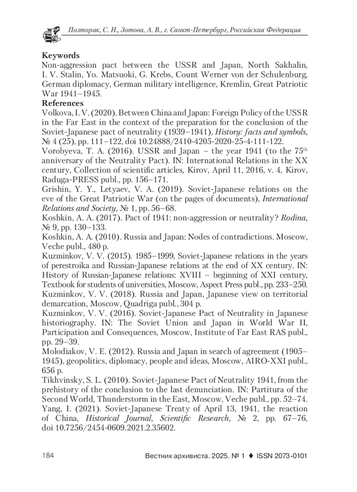 16. Slavinsky, B. (2004). The Japanese-Soviet neutrality pact, A diplomatic history, 1941-1945, London, New York, RoutledgeCurzon publ., 2004, 227 p. EDN: UEPZEL