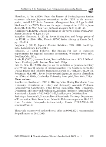 7. Плотников, А. Ю. Из истории советско-японских внешнеэкономических связей: японские концессии в СССР в межвоенный период // Вестник РГГУ. Серия: Экономика. Управление. Право. 2020. № 2. С. 94-104. EDN: DUHKSZ