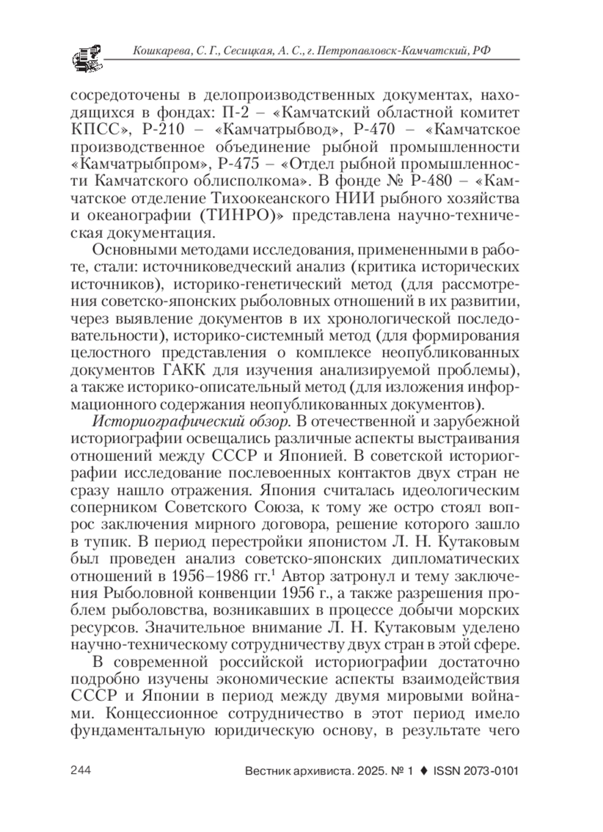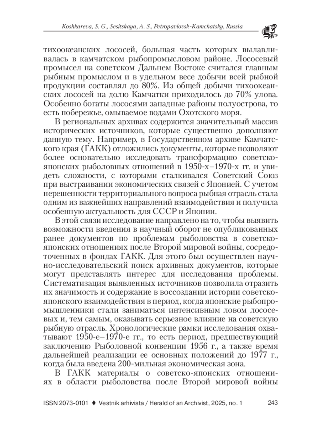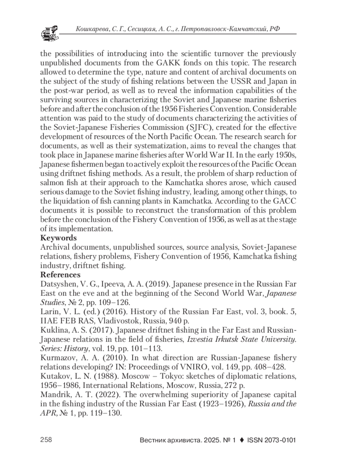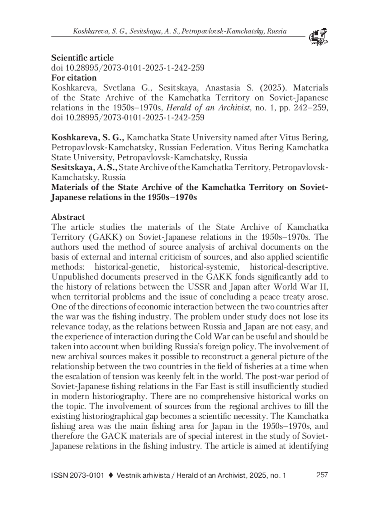 В статье исследуются материалы Государственного архива Камчатского края (ГАКК) о советско-японских отношениях в 1950-х - 1970-х гг. Авторами использован метод источниковедческого анализа архивных документов на основе внешней и внутренней критики источников, а также применялись научные методы: историко-генетический, историко-системный, историко-описательный. Неопубликованные документы, отложившиеся в фондах ГАКК, существенно дополняют историю отношений СССР и Японии после Второй мировой войны, когда возникли территориальные проблемы и вопрос заключения мирного договора. Одним из направлений экономического взаимодействия двух стран после войны стала рыбная отрасль. Исследуемая проблема не теряет своей актуальности сегодня, так как отношения России и Японии складываются непросто, а опыт взаимодействия в период холодной войны может быть полезным и должен учитываться при выстраивании внешней политики России. Привлечение новых архивных источников позволяет воссоздать общую картину взаимоотношений двух стран в области рыболовства в то время, когда эскалация напряженности остро ощущалась в мире. Послевоенный период советско-японских рыболовных отношений на Дальнем Востоке все еще недостаточно изучен в современной историографии. Комплексные исторические труды по теме отсутствуют. Привлечение источников из регионального архива для восполнения существующего историографического пробела становится научной необходимостью. Именно камчатский рыбопромысловый район был основным для Японии в 1950-х - 1970-х гг., в связи с чем материалы ГАКК представляют особый интерес в исследовании темы советско-японских отношений в рыбной отрасли. Статья направлена на то, чтобы выявить возможности введения в научный оборот не опубликованных ранее документов из фондов ГАКК по данной теме. Проведенное исследование позволило определить тип, характер и содержание архивных документов на предмет исследования рыболовных отношений СССР и Японии в послевоенный период, а также раскрыть информационные возможности сохранившихся источников при характеристике советского и японского морского промысла до и после заключения Рыболовной конвенции 1956 г. Значительное внимание уделено изучению документов, характеризующих деятельность советско-японской рыболовной комиссии (СЯРК), созданной для эффективного освоения ресурсов северной части Тихого океана. Проведенный научно-исследовательский поиск документов, а также их систематизация направлены на то, чтобы выявить изменения, которые происходили в японском морском промысле после Второй мировой войны. Если сразу после ее окончания Япония не имела возможностей проявлять себя активно в эксплуатации ресурсов Тихого океана, то в начале 1950-х гг. японские рыбопромысловики приступили к активному освоению морских запасов, применяя при этом методы дрифтерного лова. В результате возникла проблема резкого сокращения лососевых рыб при их подходе к камчатским берегам, что наносило серьезный урон советской рыбной промышленности, приводило в том числе к ликвидации рыбоконсервных заводов Камчатки. По документам ГАКК можно воссоздать трансформацию этой проблемы до заключения Рыболовной конвенции 1956 г., а также на этапе ее реализации.