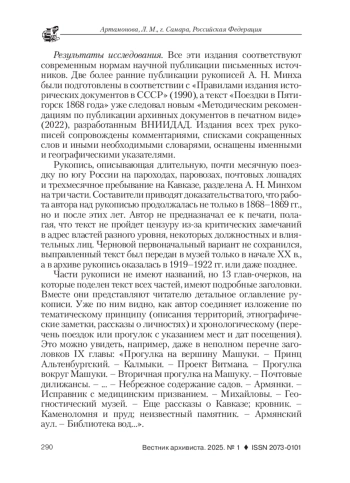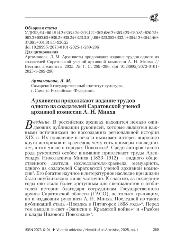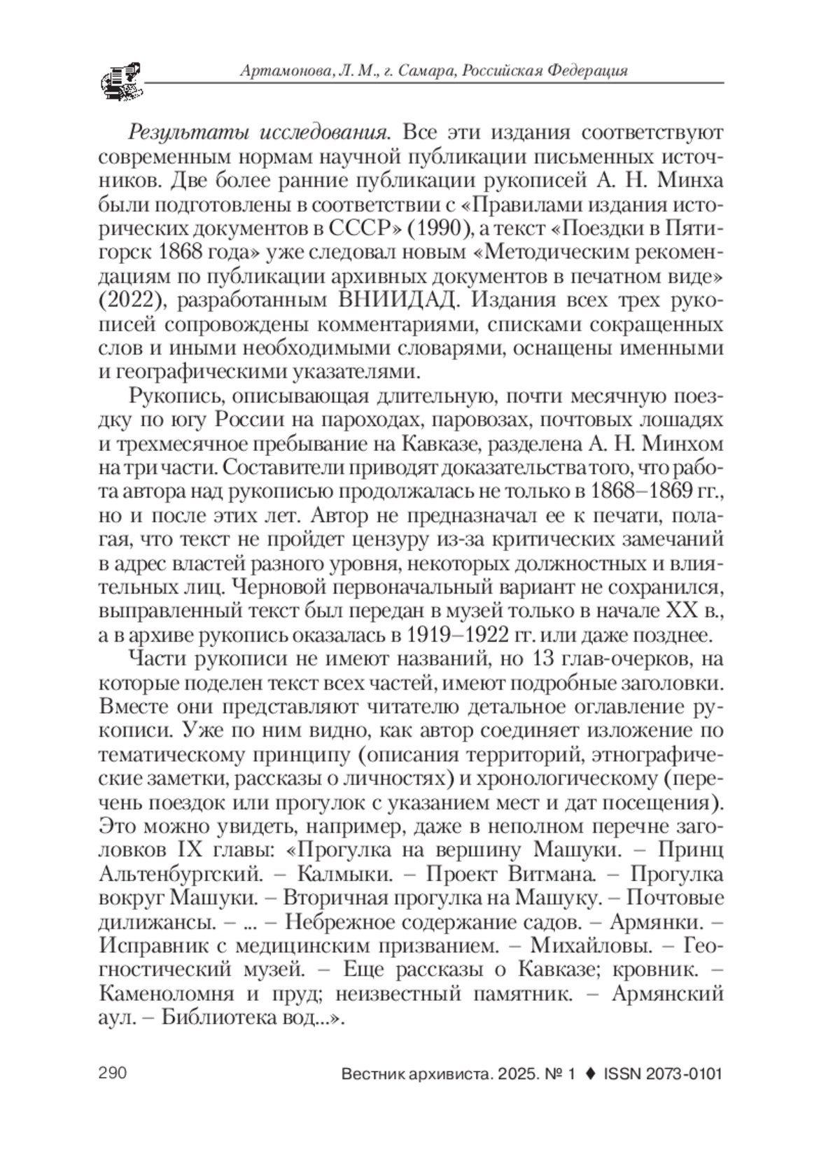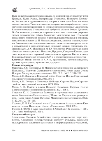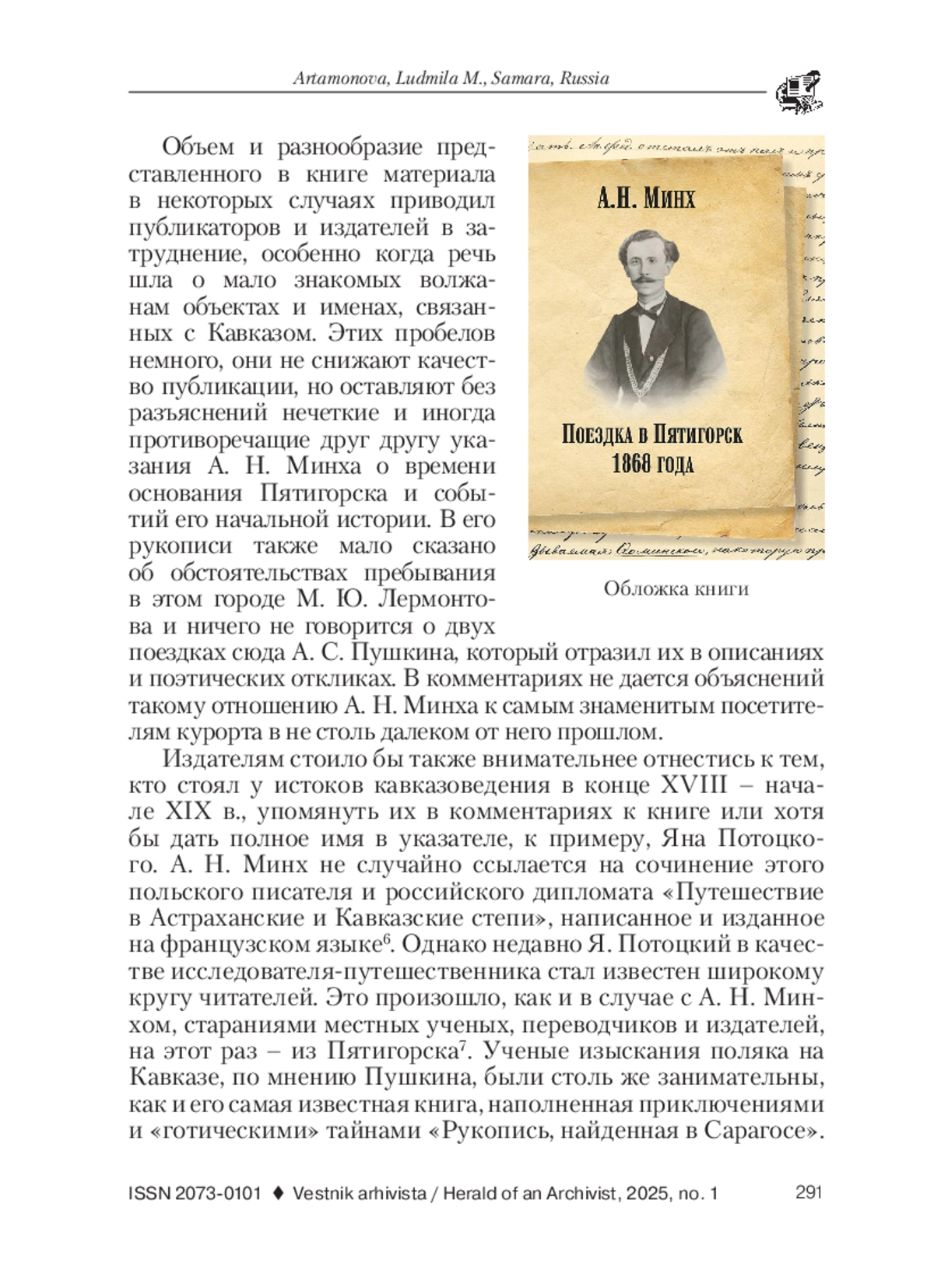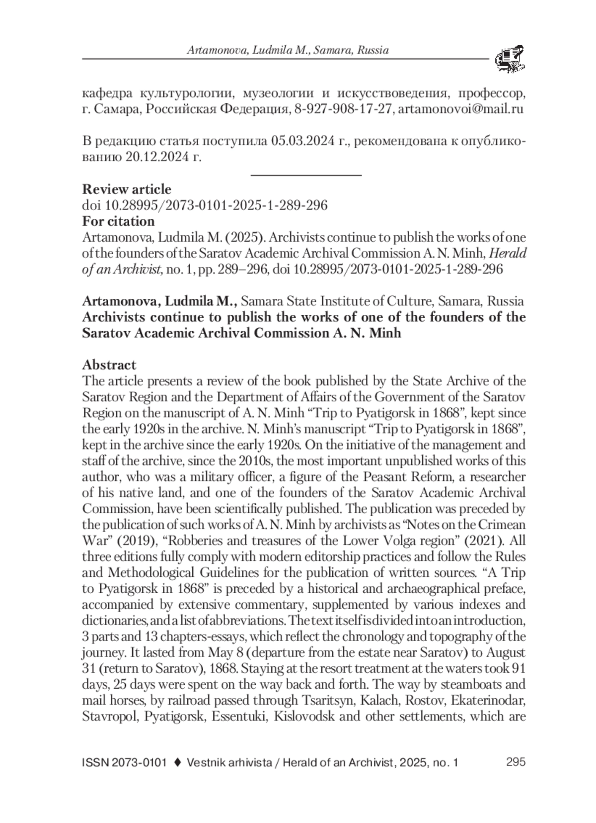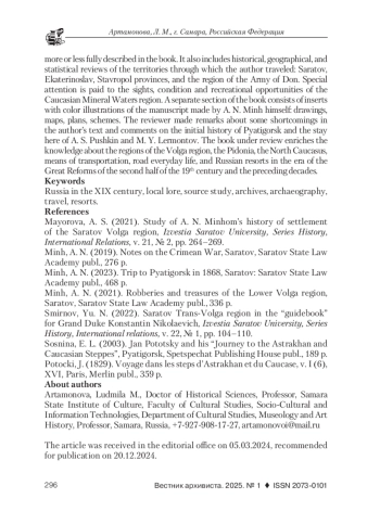 В статье представлен обзор изданной Государственным архивом Саратовской области и Управлением делами Правительства Саратовской области книги по рукописи А. Н. Минха «Поездка в Пятигорск 1868 года», хранящейся с начала 1920-х гг. в архиве. По инициативе руководства и сотрудников архива с 2010-х гг. осуществляется научная публикация наиболее важных с точки зрения мемуаристики и краеведения неопубликованных трудов этого автора, являвшегося боевым офицером, деятелем Крестьянской реформы, исследователем родного края, одним из основателей Саратовской ученой архивной комиссии. Изданию предшествовали публикации архивистами таких трудов А. Н. Минха, как «Записки о Крымской войне» (2019), «Разбои и клады Низового Поволжья» (2021). Все три издания полностью соответствуют современным эдиционным практикам, следуют Правилам и Методическим указаниям о публикации письменных источников. «Поездку в Пятигорск 1868 года» предваряет историческое и археографическое предисловие, сопровождают обстоятельные комментарии, дополняют различные указатели и словари, список сокращений. Собственно текст делится на вступление, три части и 13 глав-очерков, в которых отражены хронология и топография путешествия. Оно продлилось с 8 мая (выезд из усадьбы под Саратовом) до 31 августа (возвращение в Саратов) 1868 г. Пребывание на курортном лечении на водах заняло 91 день, 25 дней потрачено на дорогу туда и обратно. Путь на пароходах и почтовых лошадях, по железной дороге пролегал через Царицын, Калач, Ростов, Екатеринодар, Ставрополь, Пятигорск, Ессентуки, Кисловодск и другие поселения, которым в книге даны более или менее полные описания. Также в нее внесены исторические, географические, статистические обзоры территорий, по которым автор проследовал: Саратовской, Екатеринославской, Ставропольской губерний, области Войска Донского. Особое внимание уделено достопримечательностям, состоянию, рекреационным возможностям района Кавказских минеральных вод. Отдельный раздел книги составляют вклейки с цветными иллюстрациями к рукописи, выполненными самим А. Н. Минхом: рисунками, картами, планами, схемами. Рецензент сделал замечания о некоторых недостатках в авторском тексте и комментариях к нему относительно начальной истории Пятигорска, пребывания здесь А. С. Пушкина и М. Ю. Лермонтова. Рецензируемая книга обогащает знания о регионах Поволжья, Придонья, Северного Кавказа, средствах передвижения, дорожной повседневности, курортах России в эпоху Великих реформ второй половины XIX в. и предшествующие десятилетия.