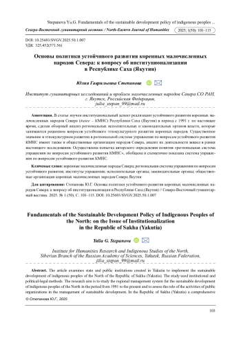 В статье изучен институциональный аспект реализации устойчивого развития коренных малочисленных народов Севера (далее - КМНС) Республики Саха (Якутия) в период с 1991 г. по настоящее время, сделан обзорный анализ региональных исполнительных и законодательных органов власти, которые занимаются решением вопросов устойчивого этнокультурного развития коренных народов. Существенное значение в этнокультурном развитии в региональной системе управления по вопросам устойчивого развития КМНС имеют также и общественные организации народов Севера, анализ их деятельности вошел в рамки настоящего исследования. Осуществлена попытка авторского определения понятия «региональная система управления по вопросам устойчивого развития КМНС», обобщена и схематично показана система управления по вопросам устойчивого развития КМНС.