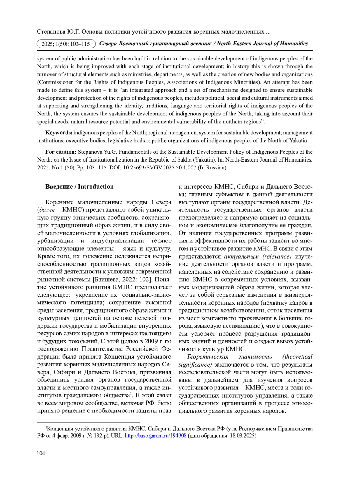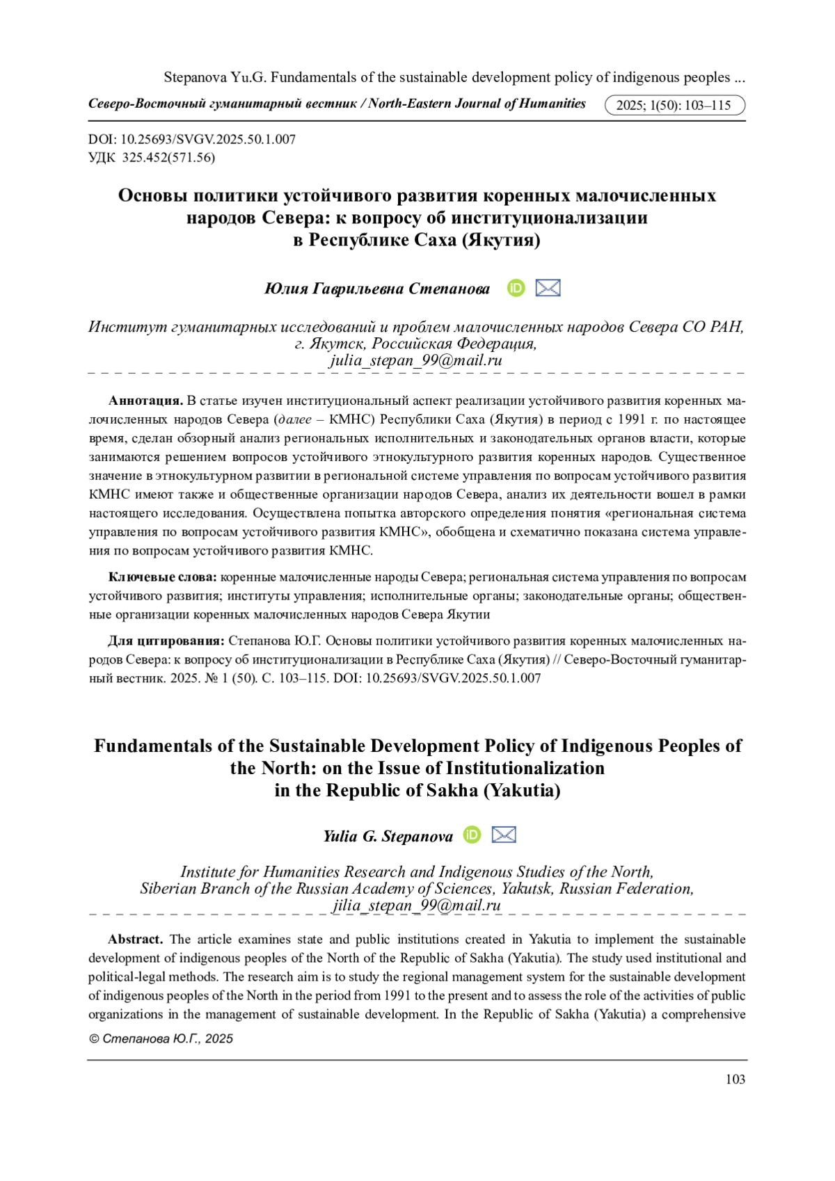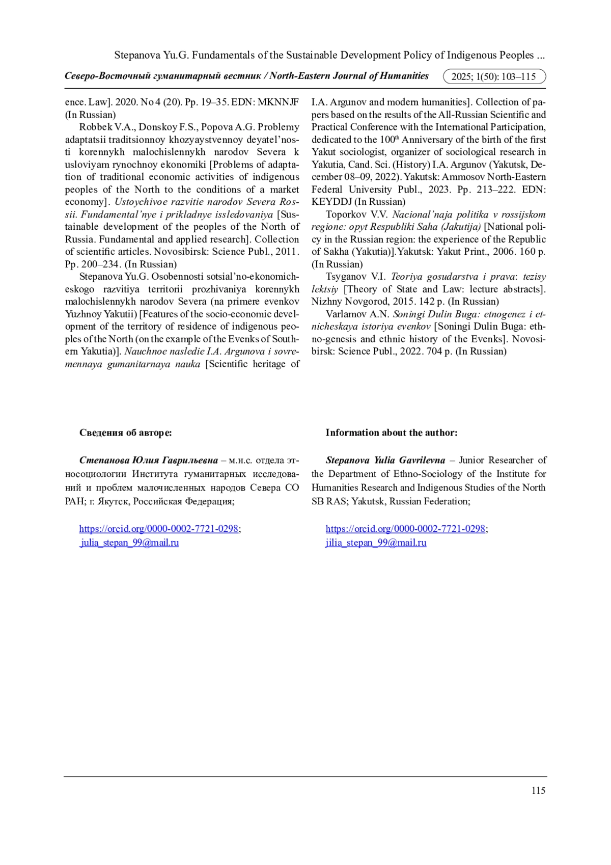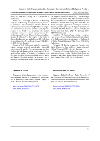 14. Степанова Ю.Г. Особенности социально-экономического развития территории проживания коренных малочисленных народов Севера (на примере эвенков Южной Якутии) // Научное наследие И.А. Аргунова и современная гуманитарная наука: сб. тр. по итогам Всеросс. науч.-практ. конф. с междунар. уч., посв. 100-лет. со дня рожд. перв. якут. социолога, организ. социологич. исслед. в Якутии, к.и.н. И.А. Аргунова (г. Якутск, 8-9 декабря 2022 г.). Якутск: Изд. дом СВФУ. 2023. С. 213-222. EDN: KEYDDJ