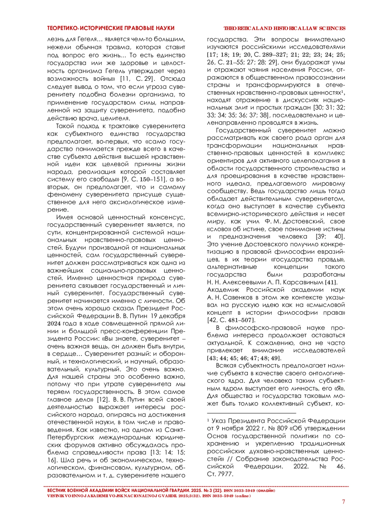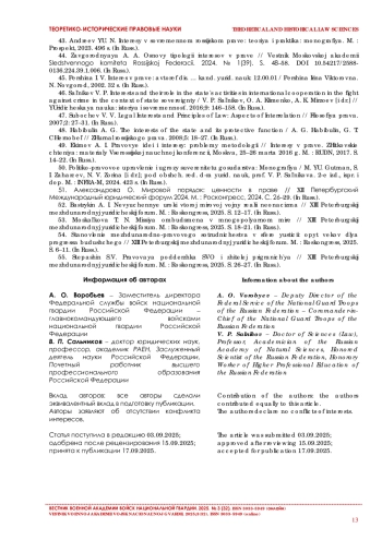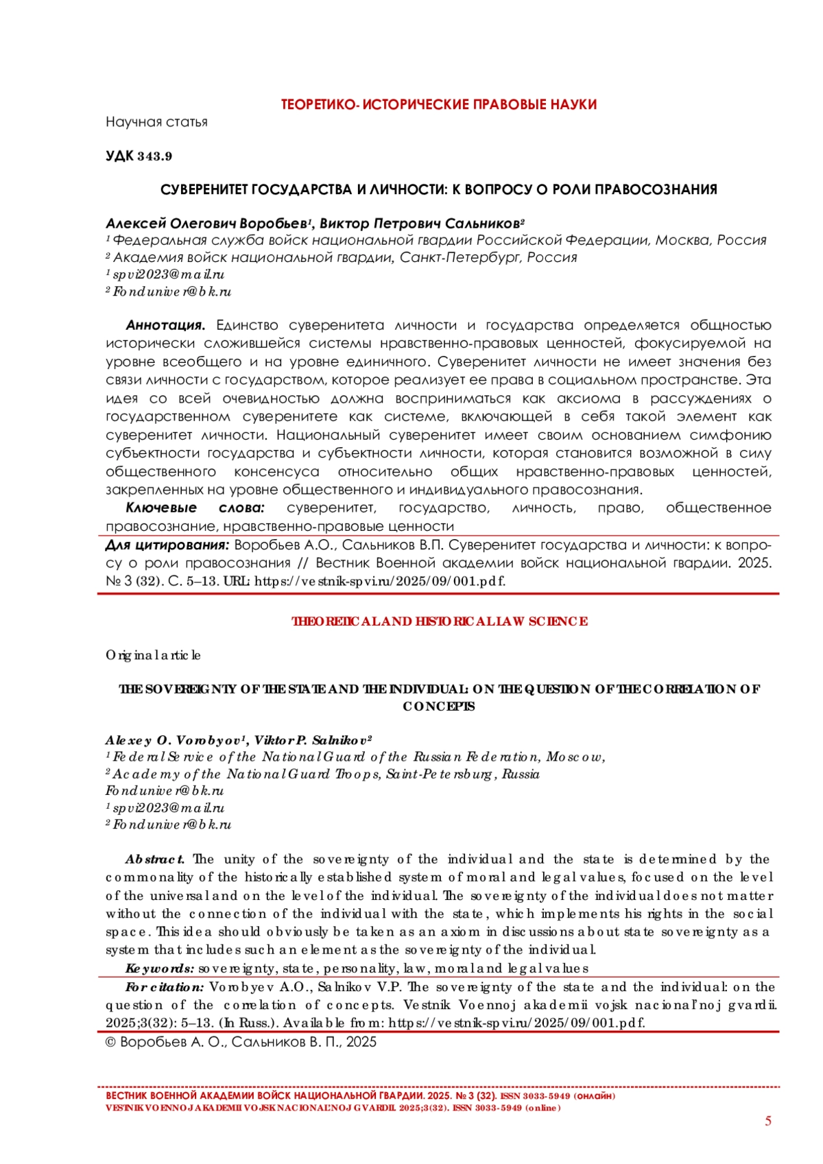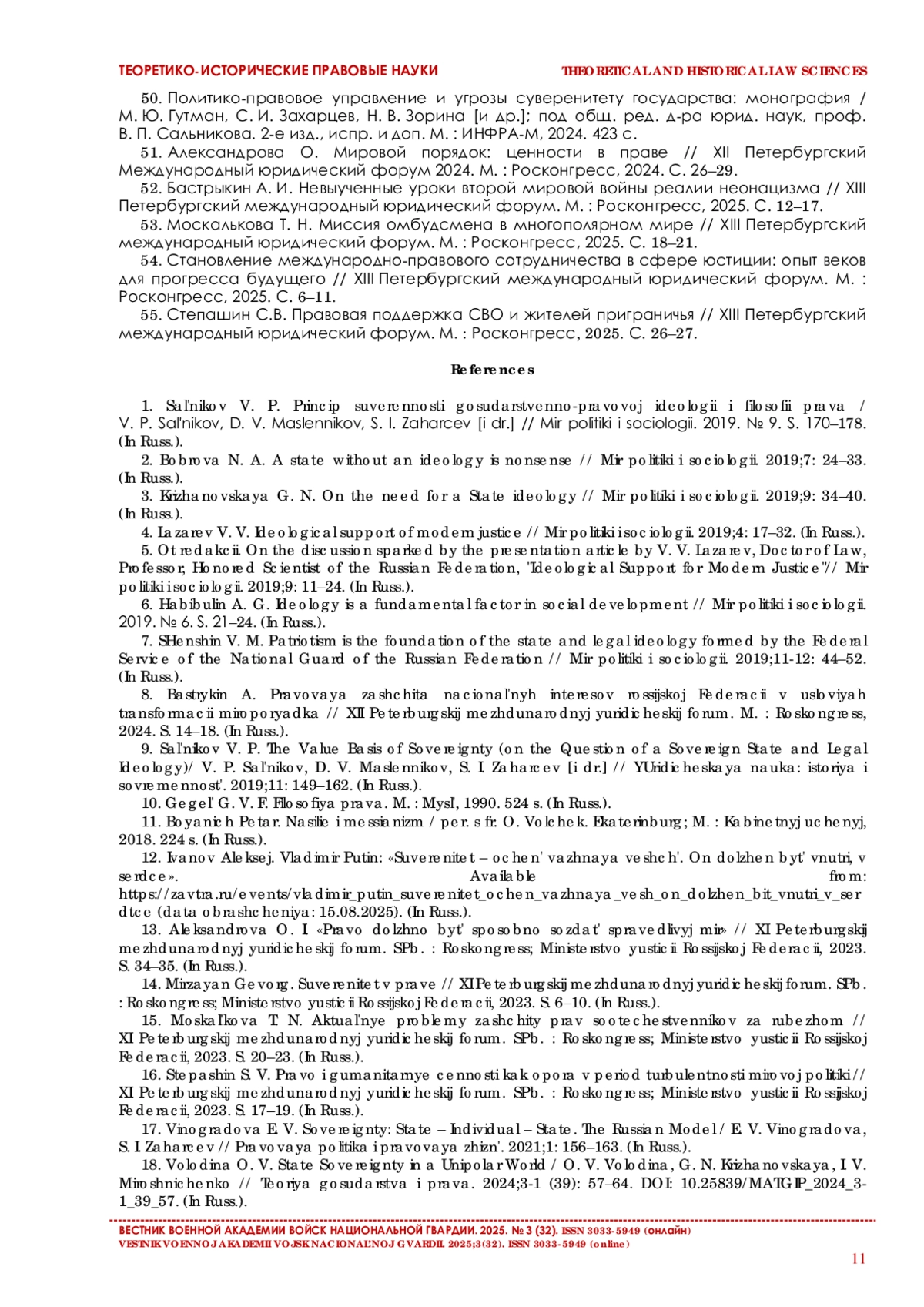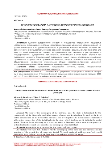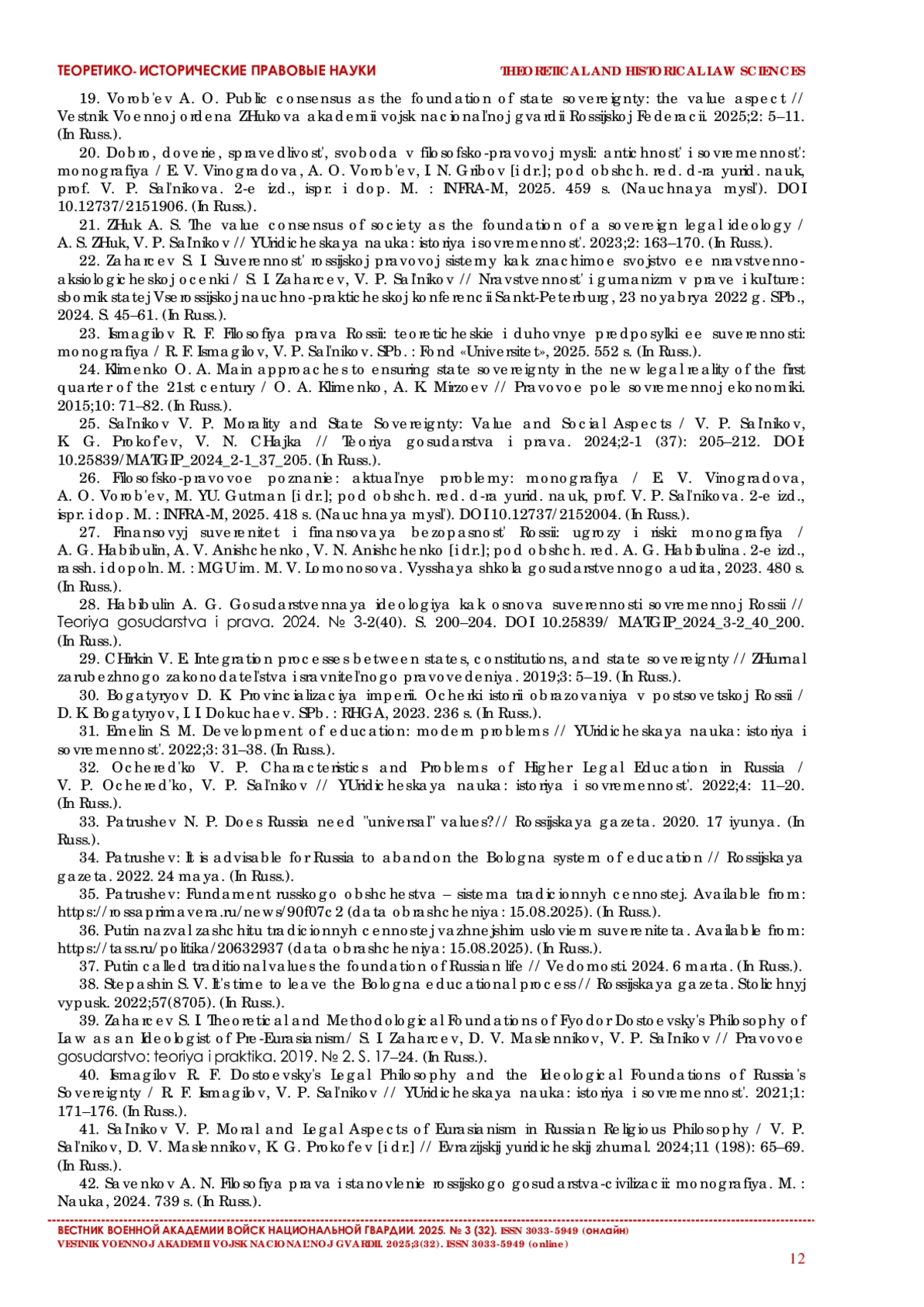 19. Воробьев А. О. Общественное согласие как основание государственного суверенитета: ценностный аспект // Вестник Военной ордена Жукова академии войск национальной гвардии Российской Федерации. 2025. № 2. С. 5-11.