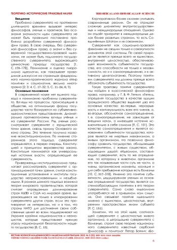18. Володина О. В. Государственный суверенитет в условиях однополярного мироустройства / О. В. Володина, Г. Н. Крижановская, И. В. Мирошниченко // Теория государства и права. 2024. № 3-1 (39). С. 57-64. DOI: 10.25839/MATGIP_2024_3-1_39_57 EDN: HVYGFQ