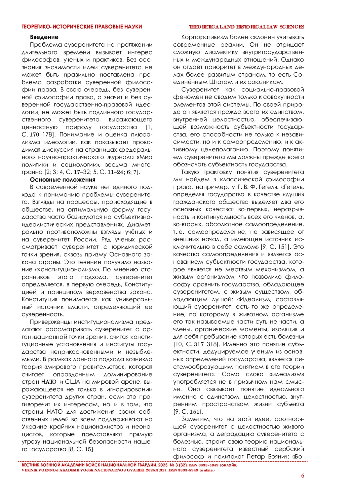 Проблема суверенитета на протяжении длительного времени вызывает интерес философов, ученых и практиков. Без осознания значимости идеи суверенитета не может быть правильно поставлена про-блема разработки суверенной философии права. В свою очередь, без суверенной философии права, а значит и без суверенной государственно-правовой идеологии, не может быть подлинного государственного суверенитета, выражающего ценностную природу государства [1, С. 170–178]. Понимание и оценка плюрализма идеологии, как показывает проводимая дискуссия на страницах федерального научно-практического журнала «Мир политики и социологии», весьма много-гранна [2; 3; 4, С. 17–32; 5, С. 11–24; 6; 7].