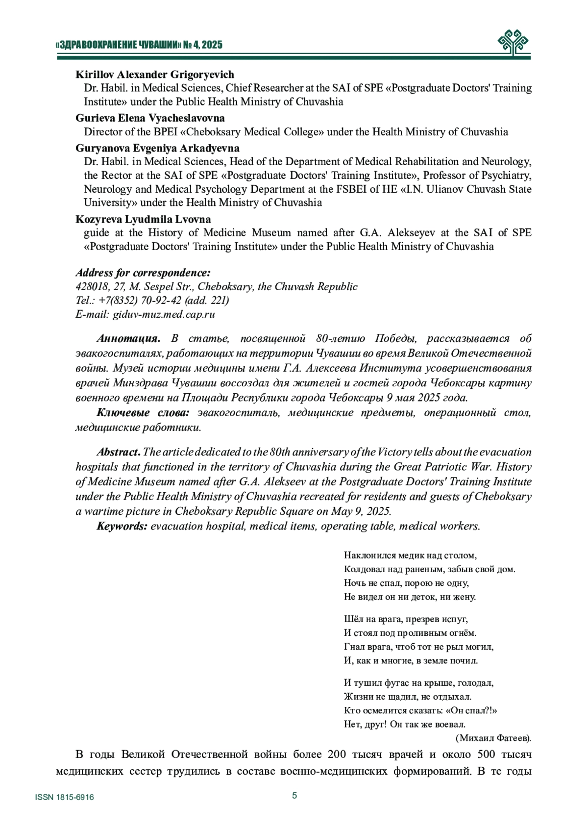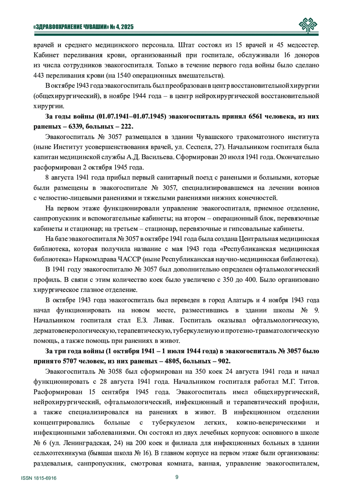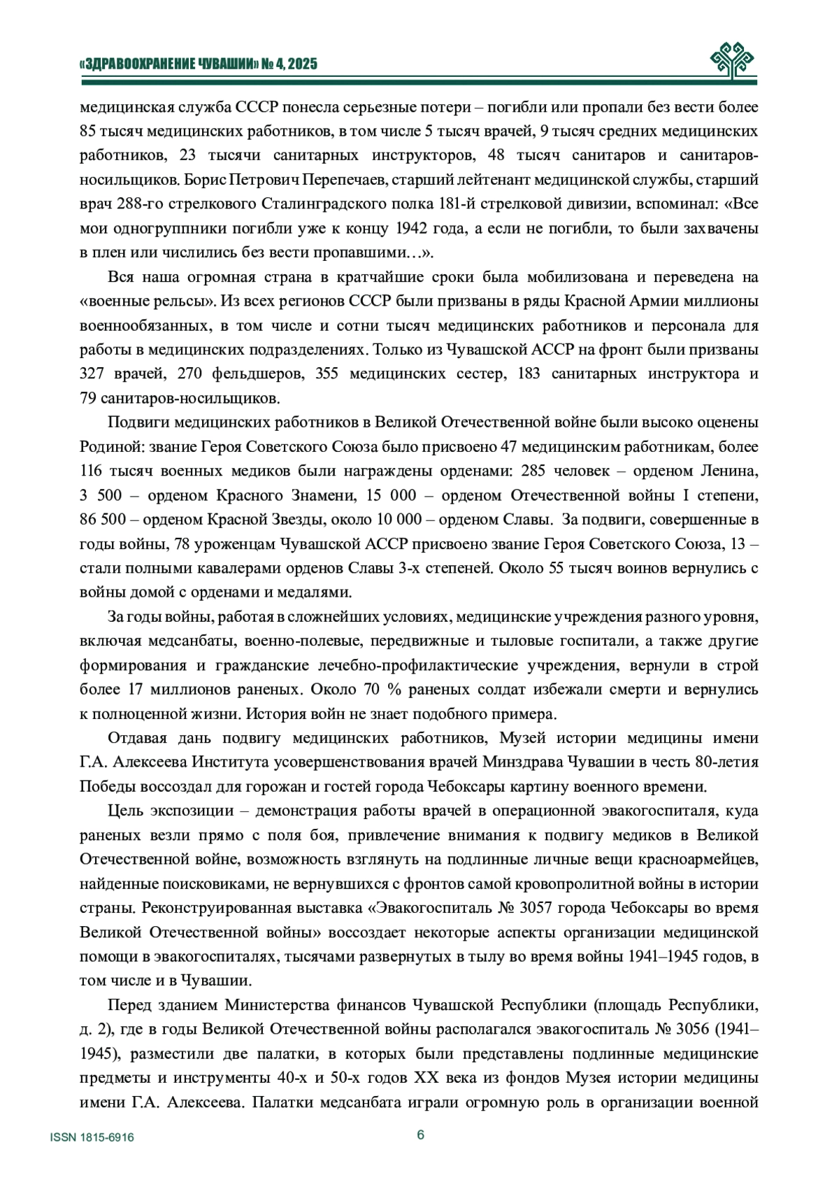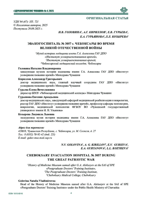 В статье, посвященной 80-летию Победы, рассказывается об эвакогоспиталях, работающих на территории Чувашии во время Великой Отечественной войны. Музей истории медицины имени Г. А. Алексеева Института усовершенствования врачей Минздрава Чувашии воссоздал для жителей и гостей города Чебоксары картину военного времени на Площади Республики города Чебоксары 9 мая 2025 года.