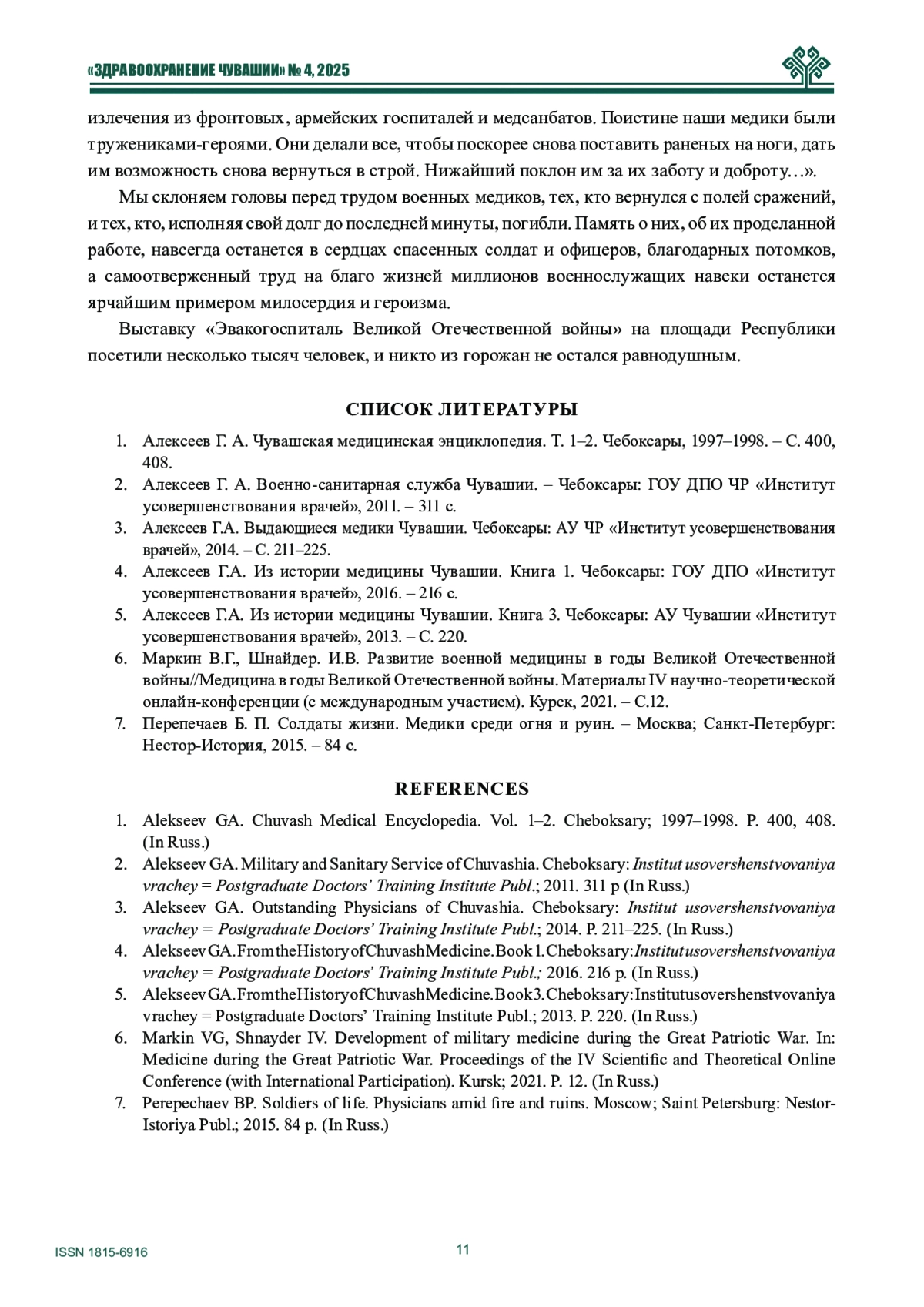 2. Алексеев Г. А. Военно-санитарная служба Чувашии. - Чебоксары: ГОУ ДПО ЧР “Институт усовершенствования врачей”, 2011. - 311 с.